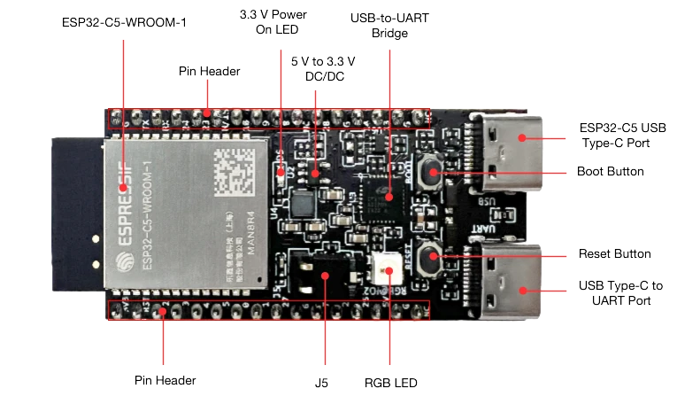 บอร์ด ESP32-C5-DevKitC-1 มีลักษณะโดยรวมคล้ายกับ ESP32-C6-DevKitC-1, ต่างกันเพียงแค่บอร์ด ESP32-C5 ใช้โมดูล ESP32-C5-WROOM-1 ที่รองรับ WiFi 6 แบบ dual-band ขณะที่บอร์ด ESP32-C6 ใช้โมดูล ESP32-C6-WROOM-1, ทั้งชิป ESP32-C5, โมดูล WROOM และบอร์ด DevKitC จะได้รับการรองรับอย่างเป็นทางการใน ESP-IDF เวอร์ชัน 5.5 ที่จะเปิดตัวในเร็ว ๆ นี้ ส่วนการรองรับในแพลตฟอร์ม Arduino คาดว่าจะใช้เวลาอีกไม่กี่เดือนนี้ สามารถดูคำแนะนำการใช้งานได้ในหน้าเว็บไซต์เอกสารประกอบของทางบริษัท, ESP32-C5 ยังสามารถใช้งานเป็น โคโปรเซสเซอร์ไร้สาย (wireless coprocessor) เชื่อมต่อกับไมโครคอนโทรลเลอร์หลักหรือโปรเซสเซอร์แอปพลิเคชัน โดยใช้เฟิร์มแวร์ ESP-AT หรือ ESP-Hosted ได้อีกด้วย