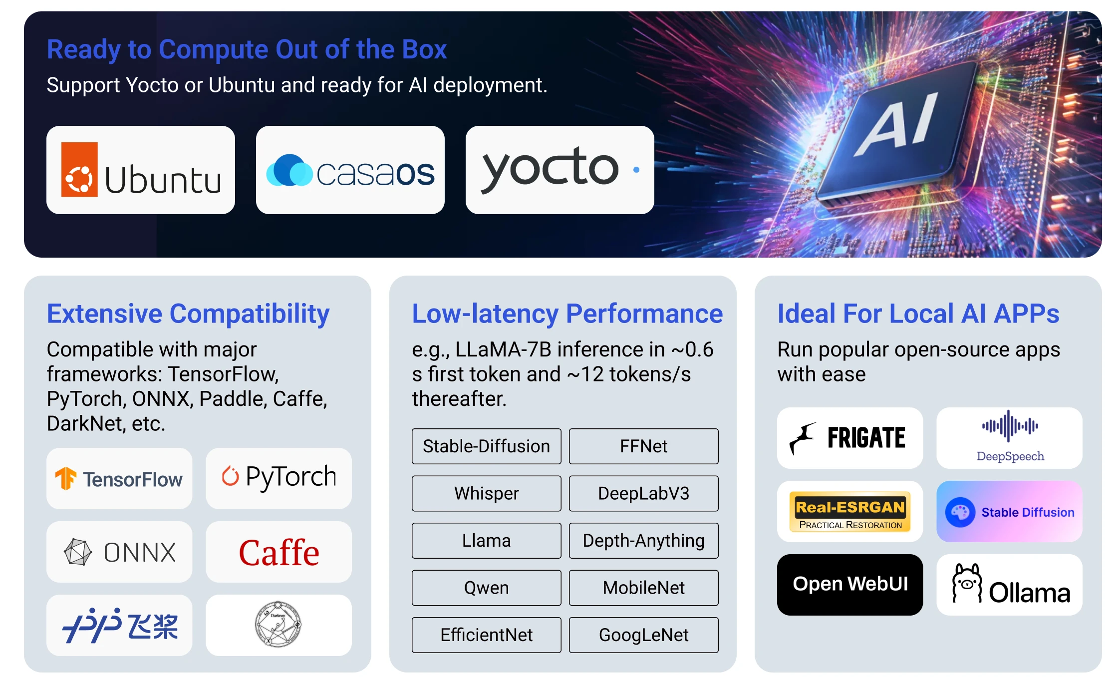 Radxa ระบุว่ารองรับ Ubuntu และ Yocto Linux รวมถึงเฟรมเวิร์ก AI อย่าง TensorFlow, PyTorch, ONNX และอื่น ๆ สามารถรันโมเดล AI เช่น GPT, LLaMa และ Stable Diffusion locally ได้ ยังคงใช้ CasaOS เพื่อให้ง่ายต่อการติดตั้งและใช้งาน เช่นเดียวกับ Fogwise Airbox รุ่นดั้งเดิม ด้านประสิทธิภาพ การทำ inference ของ LLaMA-7B ใช้เวลา 0.6 วินาที สำหรับ token แรก จากนั้นจะเร็วขึ้นเป็นประมาณ 12 token ต่อวินาที สามารถดูรายละเอียดเพิ่มเติมได้จากประกาศของ Radxa, เพราะเว็บไซต์เอกสารยังไม่เปิดใช้งานในขณะที่เขียนโพสต์นี้