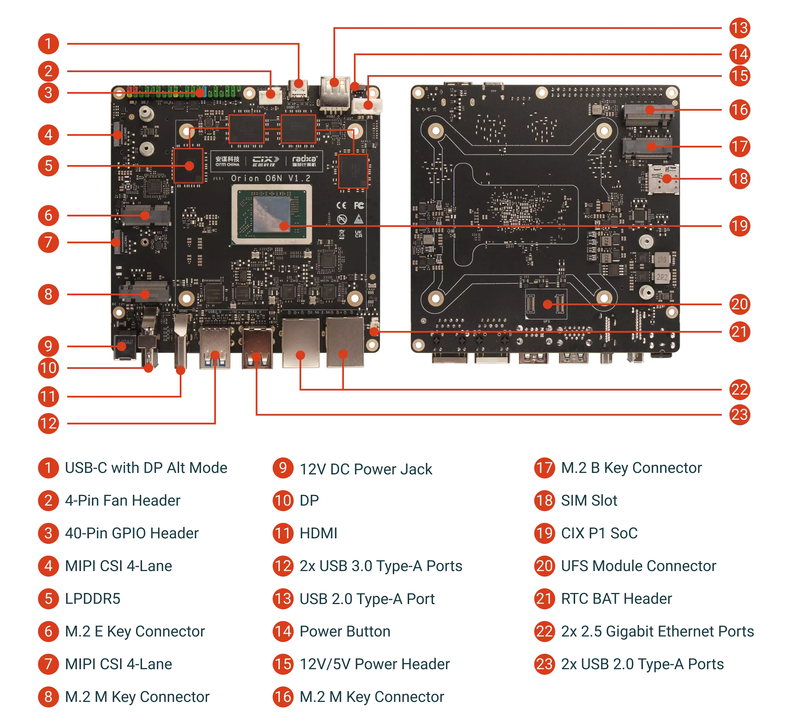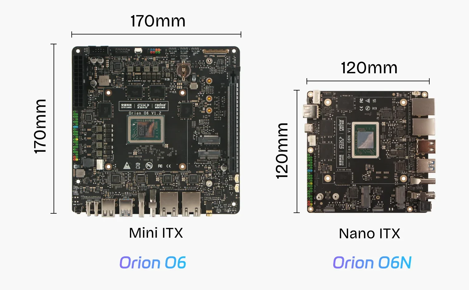 Radxa Orion O6N เป็นบอร์ด SBC ขนาด Nano-ITX ที่ใช้โปรเซสเซอร์ CIX P1 (รุ่น CD8160) แบบ 12-core ประกอบ Cortex-A720/A50 พร้อม AI accelerator ที่ให้ประสิทธิภาพ 30/45 TOPS, รองรับหน่วยความจำสูงสุด 64GB แบบ LPDDR5, ที่จัดเก็บข้อมูลแบบ UFS และ M.2 NVMe รวมถึงอินเทอร์เฟซต่าง ๆ