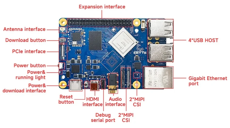 EBYTE ได้เปิดตัวบอร์ด SBC สำหรับงานอุตสาหกรรม รุ่นใหม่ที่ใช้ชิป Allwinner A527/T527 ซึ่งมีคุณสมบัติด้าน AI และกล้องคู่ (dual camera) โดยมีการออกแบบที่คล้ายกับ Walnut Pi 2B และในระดับหนึ่งก็คล้ายกับ Orange Pi 4A บอร์ดนี้ถูกออกแบบมาสำหรับงานฝังตัว (Eembedded), IoT, และ แอปพลิเคชันเชิงพาณิชย์อัจฉริยะ (smart commercial applications)