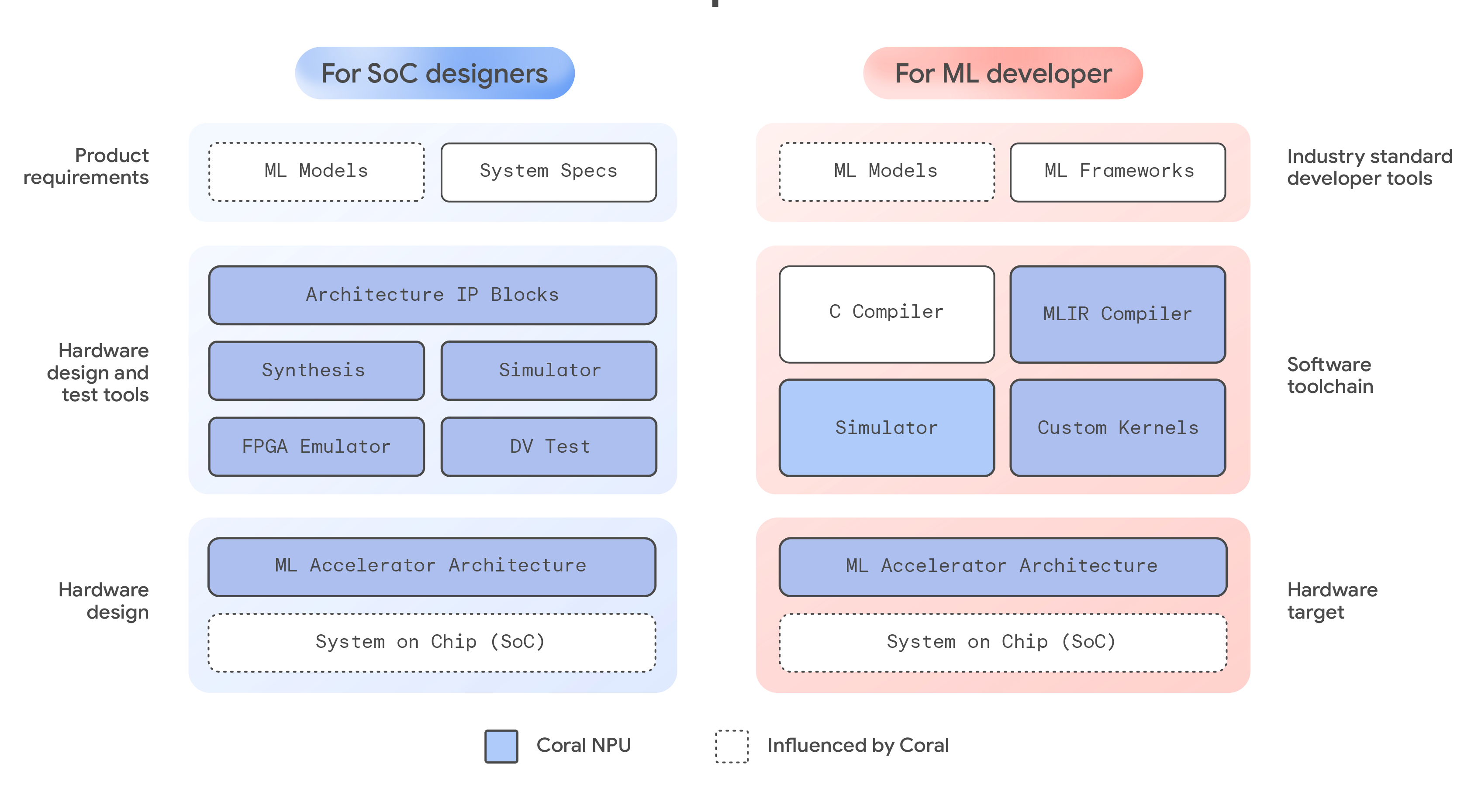 นอกจากแบบอ้างอิงของฮาร์ดแวร์ (hardware reference design) สำหรับ NPU ซึ่งเป็นประโยชน์ต่อผู้ออกแบบ SoC แล้ว Google ยังเตรียมเปิดตัวชุดเครื่องมือซอฟต์แวร์เพิ่มเติม ได้แก่ TFLM compiler สำหรับ TensorFlow, MLIR compiler, ตัวจำลองการทำงาน (simulator) และ custom kernels การออกแบบพื้นฐานของ Coral NPU นี้ให้ประสิทธิภาพประมาณ 512 GOPS ขณะใช้พลังงานเพียงไม่กี่มิลลิวัตต์ เหมาะสำหรับอุปกรณ์ที่ใช้พลังงานจากแบตเตอรี่ เช่น edge devices, อุปกรณ์สวมใส่หู (hearables), แว่นตา AR, และสมาร์ทวอทช์ คุณสามารถดูเอกสารและเครื่องมือต่าง ๆ ได้บนเว็บไซต์ Google Developers, รวมถึงรายละเอียดเพิ่มเติมในประกาศเปิดตัวของโครงการ