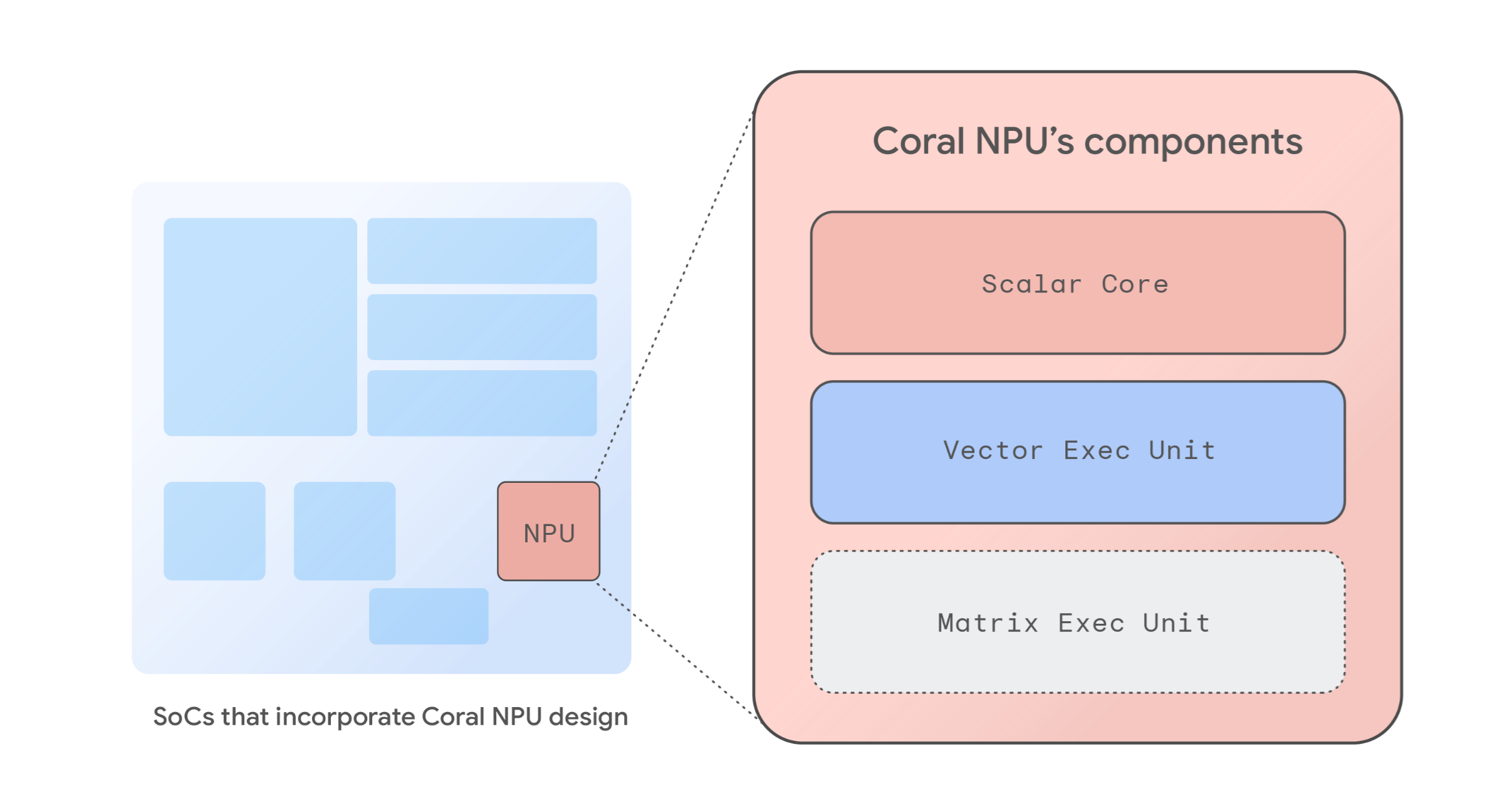 โดยต่อยอดจากการพัฒนาของแพลตฟอร์ม Coral รุ่นเดิม, Coral NPU แบบโอเพนซอร์สรุ่นใหม่ ประกอบด้วยองค์ประกอบหลัก 3 ส่วน ได้แก่:
