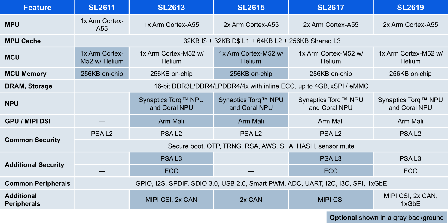 ชิปในตระกูลนี้จะมีทั้งหมด 5 รุ่น ได้แก่ SL2611, SL2613, SL2615, SL2617 และ SL2619 โดยทุกรุ่นจะมีการรวม NPU subsystem เข้ามาด้วย ยกเว้นรุ่น SL2611 บริษัทระบุว่าโปรเซสเซอร์ตระกูล Synaptics SL-series เป็น “AI-Native Linux” และ Android SoCs ที่ได้รับการปรับแต่งให้เหมาะกับงานด้าน IoT ทั้งในภาคผู้บริโภค องค์กร และอุตสาหกรรม โดยใช้ประโยชน์จาก ฮาร์ดแวร์ตัวเร่ง (hardware accelerators) กลุ่มแอปพลิเคชันเป้าหมาย ได้แก่ เครื่องใช้ไฟฟ้าในบ้านและระบบอัตโนมัติ, สินค้าอุปโภคบริโภค, ระบบควบคุมอุตสาหกรรม (industrial control systems), ระบบค้าปลีกอัจฉริยะ, โครงสร้างพื้นฐานการชาร์จไฟ, ระบบวินิจฉัยด้านสุขภาพ, เกมทั่วไป (casual gaming), หุ่นยนต์และอากาศยานไร้คนขับ (UAV)