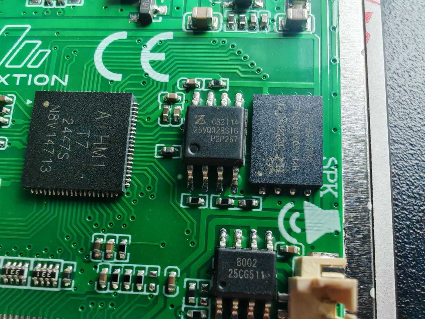 Main processor เป็นชิปของ Nextion เอง ที่ไม่มีข้อมูล Datasheet อะไรให้เราค้นหาต่อ แต่จากรูปจะแสดงว่าเป็น Ai HMI ถัดมาคือ SPI NOR flash เบอร์ 25VQ32BSIG จาก Zbit Semi