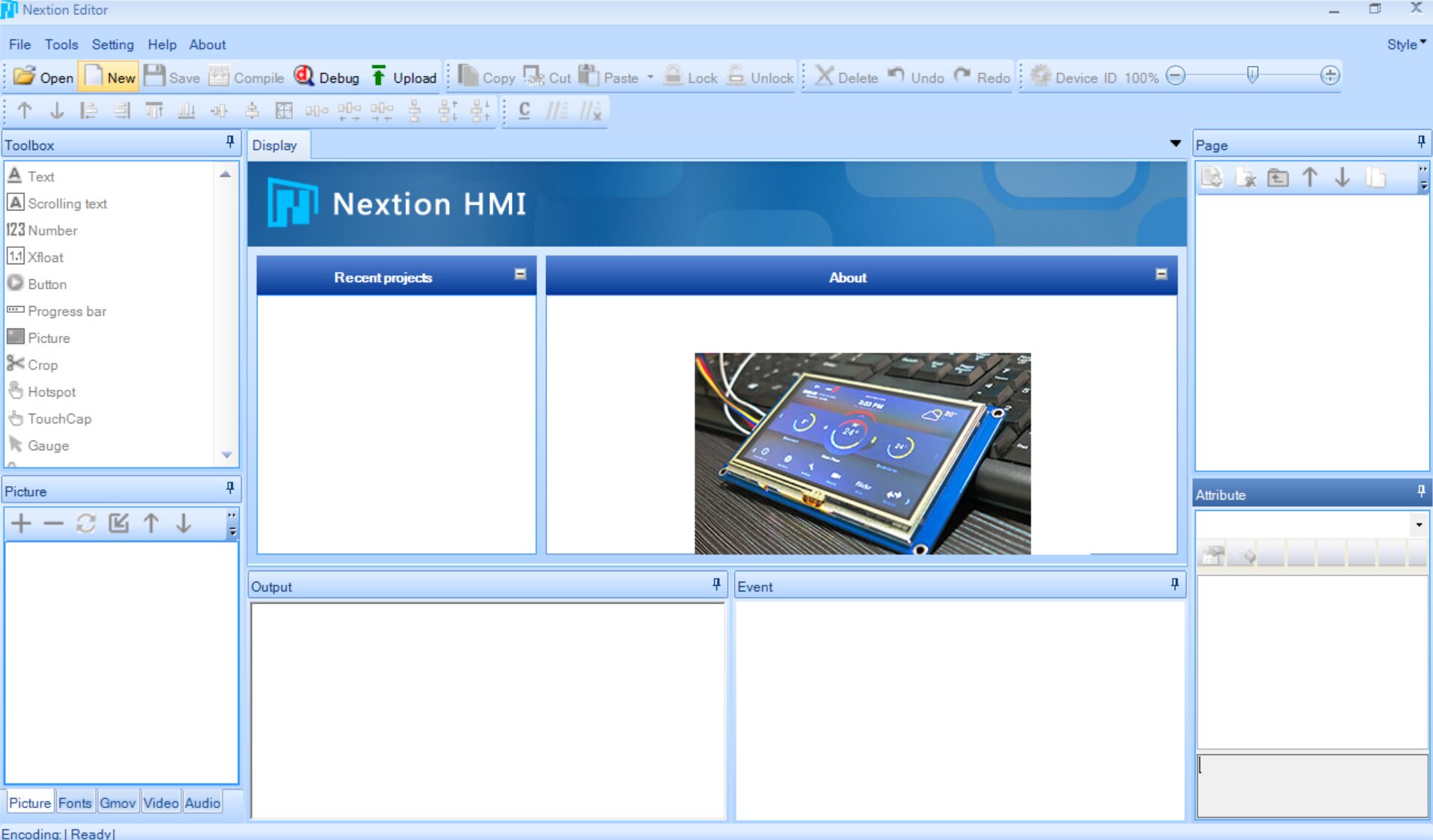การออกแบบ UI เมื่อเปิด Nextion Editor จะสามารถสร้างโปรเจกต์ใหม่และเริ่มออกแบบหน้าจอต่างๆ ตามที่ต้องการ และสามารถดูคู่มือออนไลน์ได้