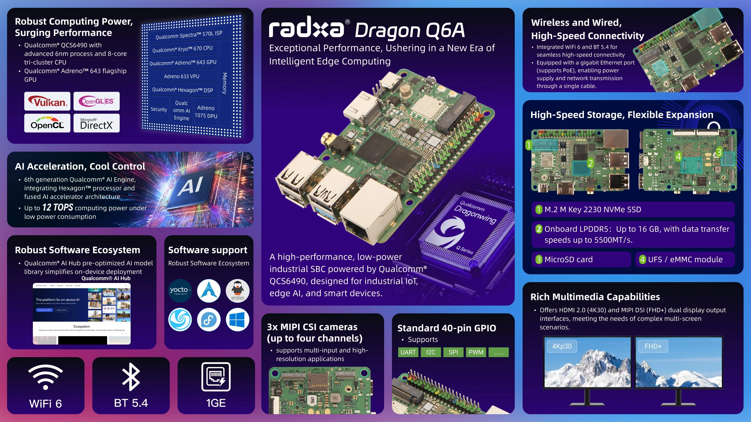 Radxa Dragon Q6A เป็นบอร์ดคอมพิวเตอร์เดี่ยว (SBC) ขนาดเท่าบัตรเครดิตรุ่นใหม่ที่กำลังจะเปิดตัว โดยใช้ชิป SoC Qualcomm QCS6490 แบบ octa-core พร้อม AI accelerator 12 TOPS, หน่วยความจำ LPDDR5 สูงสุด 16GB และมาพร้อมพอร์ตเชื่อมต่อต่างๆ ที่พบได้ทั่วไปในบอร์ดลักษณะเดียวกับ Raspberry Pi เช่น พอร์ต Gigabit Ethernet, พอร์ต USB 4 ช่อง, พอร์ต HDMI สำหรับแสดงผลวิดีโอ และ GPIO header แบบ 40 พิน