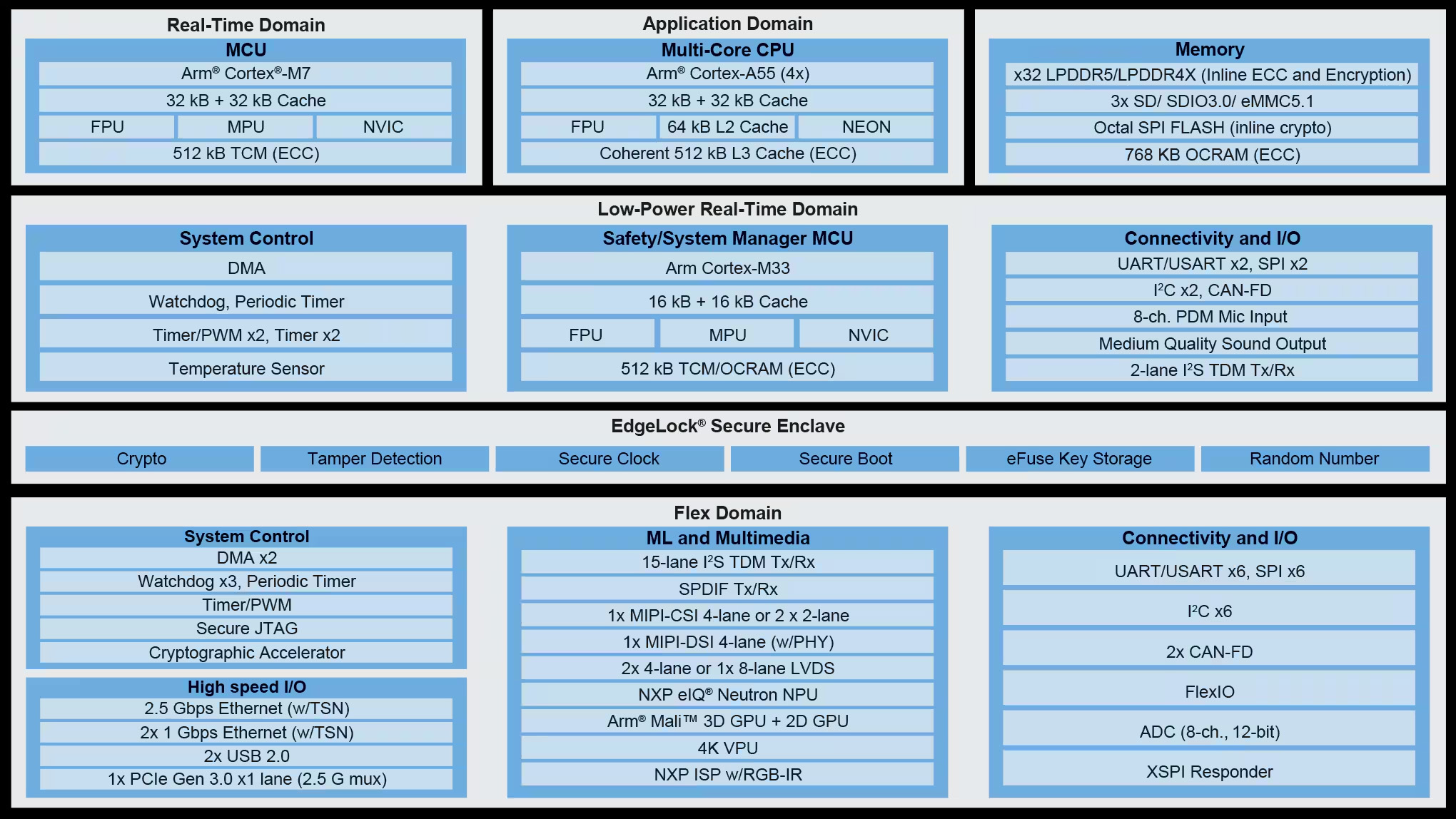 จากบล็อกไดอะแกรมสเปกและคำอธิบายโดยรวม โปรเซสเซอร์ i.MX 952 มีสถาปัตยกรรมแบบ heterogeneous ที่ประกอบด้วยแกนประมวลผล Cortex-A55, Cortex-M7, และ Cortex-M33, รวมถึง eIQ Neutron NPU และ ISP ประสิทธิภาพสูง เช่นเดียวกับรุ่น i.MX 95 แต่เพิ่มคุณสมบัติใหม่ ได้แก่ ฟังก์ชัน local dimming สำหรับจอแสดงผล และ การเข้ารหัสหลังยุคควอนตัม (Post-Quantum Cryptography; PQC) ภายในโมดูลความปลอดภัย EdgeLock Secure Enclave เมื่อเทียบกับรุ่น i.MX 95, รุ่น i.MX 952 มีการปรับลดจำนวนคอร์ของ CPU (จาก 6 เหลือ 4), หน่วยความจำภายใน (on-chip memory), และพอร์ตเชื่อมต่อความเร็วสูงบางส่วน (ไม่มี USB 3.0 และ 10GbE) เพื่อให้ได้สมดุลที่เหมาะสมยิ่งขึ้นระหว่าง ประสิทธิภาพการทำงานและความปลอดภัย (รองรับได้ถึงระดับ SIL 3)