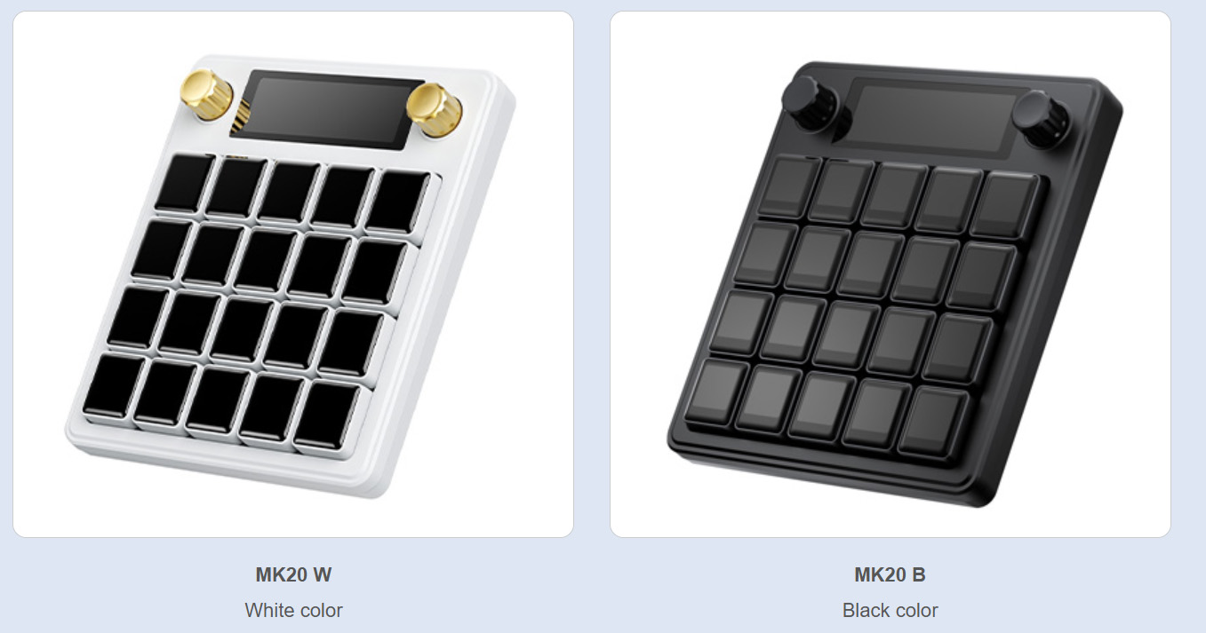 Waveshare MK20 เป็นคีย์บอร์ดมาโครแบบอเนกประสงค์ มาพร้อมปุ่ม mechanical 20 ปุ่ม แต่ละปุ่มมีจอ LCD ขนาด 0.85 นิ้วในตัว รุ่นนี้เป็นการอัปเกรดจากรุ่นก่อนหน้า MK10 โดยเพิ่มจอแสดงผลรองขนาด 2.8 นิ้วและปุ่มหมุนควบคุม (knob) อีก 2 ตัว อุปกรณ์รองรับการโต้ตอบด้วยเสียง AI การแสดงข้อมูลแบบเรียลไทม์ และการเชื่อมต่อกับระบบสมาร์ทโฮมผ่าน Home Assistant