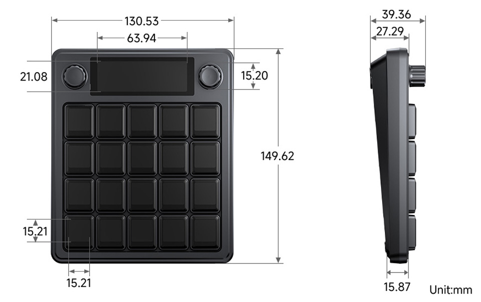 - 20x ปุ่มกลไก Kailh box silent แบบ hot-swappable พร้อมจอ LCD ในตัว (ตามที่กล่าวข้างต้น)