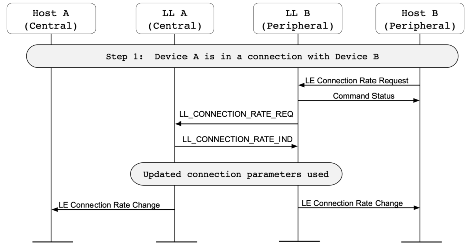 อุปกรณ์ Peripheral B ส่งคำร้องขอไปยัง Central A เพื่อเปลี่ยนอัตราการเชื่อมต่อ (connection rate)