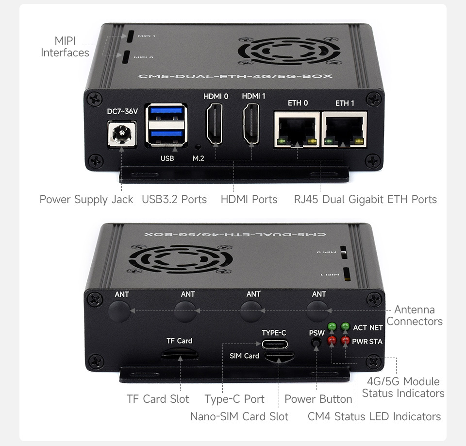 บอร์ดรุ่นนี้ยังมีพอร์ต HDMI สองช่อง รองรับการแสดงผลระดับ 4K, คอนเนกเตอร์ MIPI DSI/CSI สองชุดสำหรับจอแสดงผลหรือกล้อง, พอร์ต USB 3.2 จำนวนสองช่อง, GPIO header 40 พิน, สล็อต M.2 สำหรับทั้ง NVMe SSD และโมดูล 4G/5G, รวมถึงรองรับ PoE ผ่านโมดูลเสริม นอกจากนี้ยังรองรับแรงดันไฟฟ้า 7V–36V DC, มีพอร์ตพัดลมแบบ PWM, และแบตเตอรี่สำรอง RTC ตัวบอร์ดออกแบบให้มีช่องและพอร์ตต่าง ๆ จัดเรียงอย่างเป็นระเบียบพร้อมสัญลักษณ์กำกับอย่างชัดเจนเพื่อการติดตั้งที่ง่ายขึ้น จุดเด่นหลักเมื่อเทียบกับ CM5-DUAL-ETH-BASE คือ ขนาดที่กะทัดรัดกว่า การจัดวางพอร์ตที่เรียบร้อยบนแผงด้านหลัง และเพิ่มตัวเลือกการเชื่อมต่อ 4G LTE หรือ 5G สำหรับงานอุตสาหกรรมหรือระบบเครือข่ายขั้นสูง
