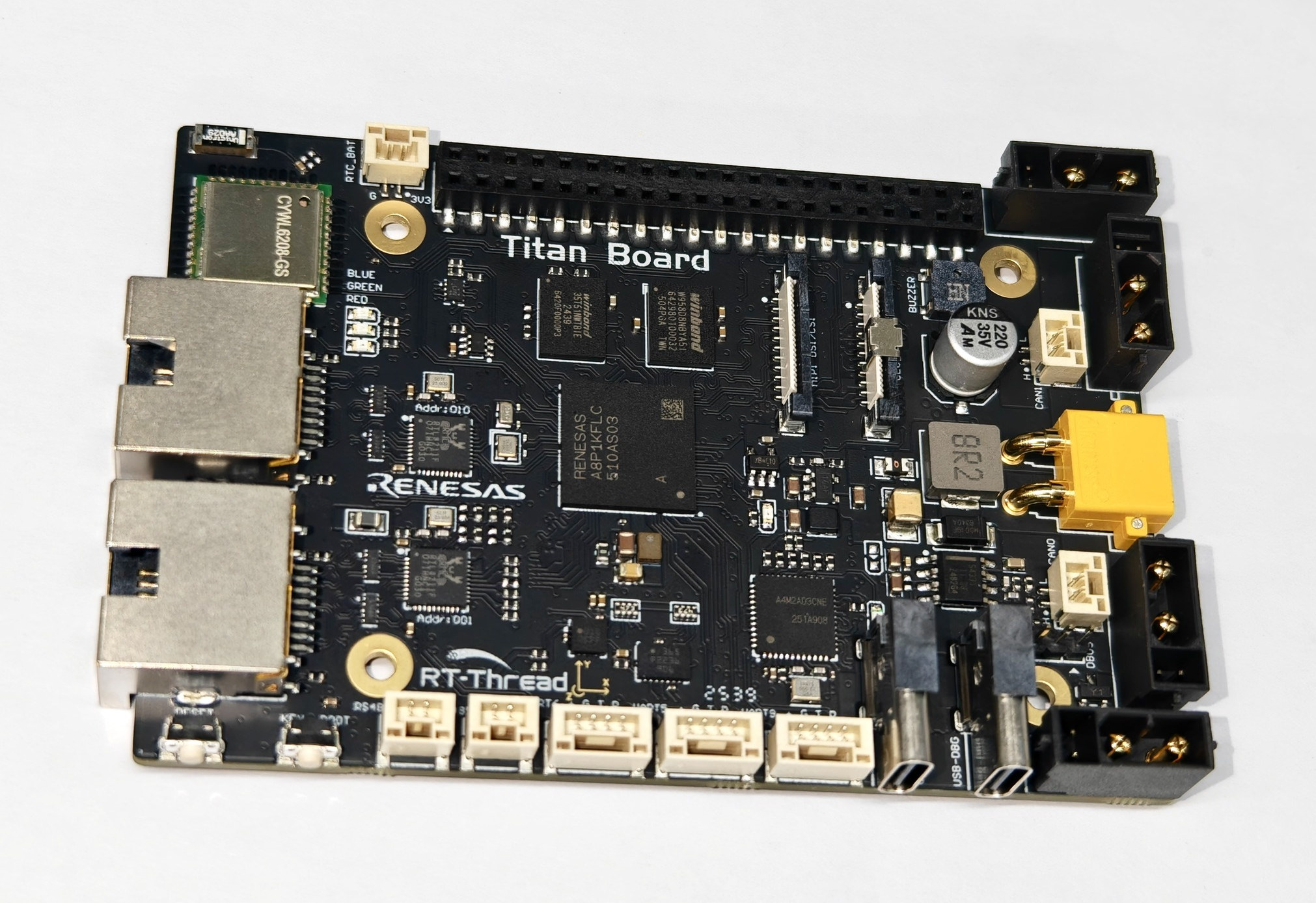 บอร์ด RA8P1 Titan ได้รับการออกแบบมาเป็นหลักเพื่อใช้สำหรับการพัฒนาและทดสอบระบบปฏิบัติการเรียลไทม์ RT-Thread โดยมาพร้อมกับหน่วยความจำ HyperRAM ขนาด 32MB, HyperFlash ขนาด 64MB, อินเทอร์เฟซสำหรับจอแสดงผลและกล้อง, พอร์ต Gigabit Ethernet จำนวนสองพอร์ตที่รองรับ Time Sensitive Networking (TSN), การเชื่อมต่อ WiFi 4 และ Bluetooth 4.1, พอร์ต USB 2.0 Type-C, การเชื่อมต่อ CAN Bus, Serial และ RS485, GPIO header แบบ 40-pin ที่เข้ากันได้กับ Raspberry Pi, ตัวดีบักเกอร์ในตัว และตัวเลือกการจ่ายไฟที่ยืดหยุ่นทั้ง 5V ผ่านพอร์ต USB-C หรือ 9V-24V ผ่านคอนเนกเตอร์ XT60