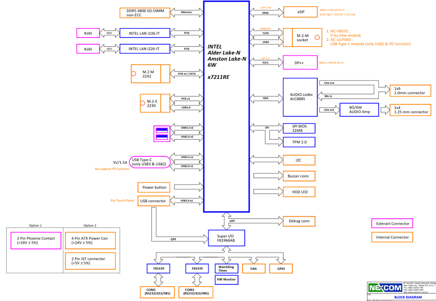 - แหล่งจ่ายไฟ – อินพุต 24V DC ผ่านคอนเนกเตอร์ ATX 4-พินหรือคอนเนกเตอร์ Phoenix 2-พิน