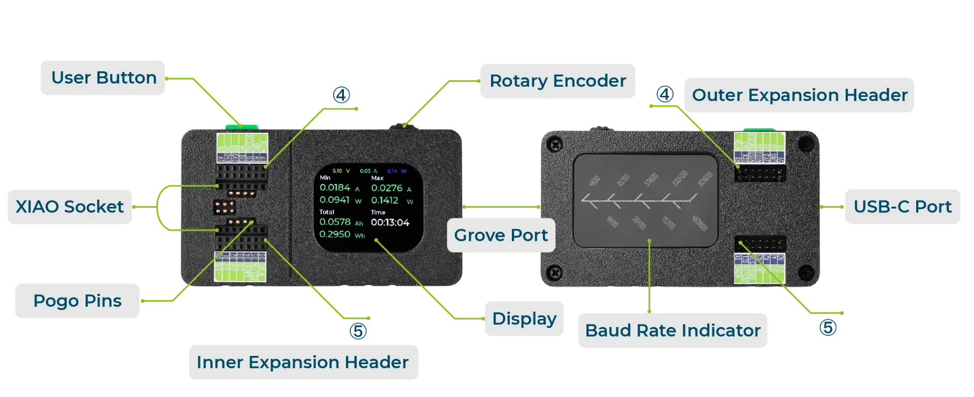 ตัวดีบักเกอร์มาพร้อม Flash 8MB, PSRAM 8MB, หน้าจอขนาด 2.01 นิ้วสำหรับแสดงข้อมูลดีบัก/พลังงาน, Headers 14 พินจำนวนสองชุดเพื่อเข้าถึงขา I/O ของโมดูล XIAO ได้อย่างสะดวก, ไฟ LED 36 ดวงสำหรับแสดงสถานะ, ปุ่มกดสองปุ่ม และล้อเลื่อนสำหรับนำทางในเมนู, ฟังก์ชัน Serial monitor ยังสามารถใช้งานร่วมกับ Arduino, Raspberry Pi หรือบอร์ดอื่น ๆ ได้ด้วย