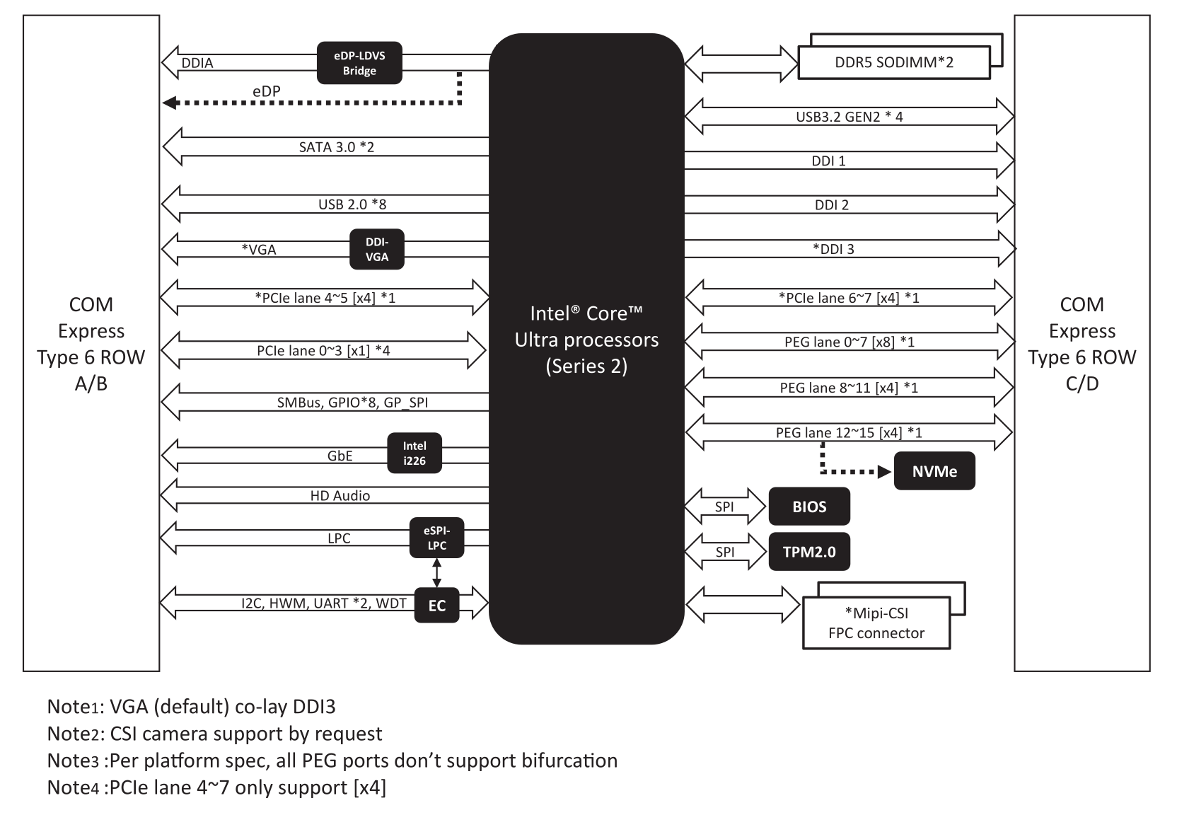 โมดูล (Computer-on-Module)มาพร้อม SO-DIMM sockets 2 ช่อง รองรับหน่วยความจำ DDR5 สูงสุด 128GB ที่ 6400MHz, ชิป NVMe SSD แบบ BGA สูงสุด 256GB (ออปชัน), คอนโทรลเลอร์ 2.5GbE, คอนเนกเตอร์ MIPI CSI จำนวน 2 ชุด และคอนเนกเตอร์ board-to-board มาตรฐาน 220 พิน จำนวน 2 ชุด ที่รองรับ SATA, วิดีโอ (HDMI, DP, LVDS/eDP, VGA), USB รวมถึง PCIe และ PEG หลายช่องสัญญาณ