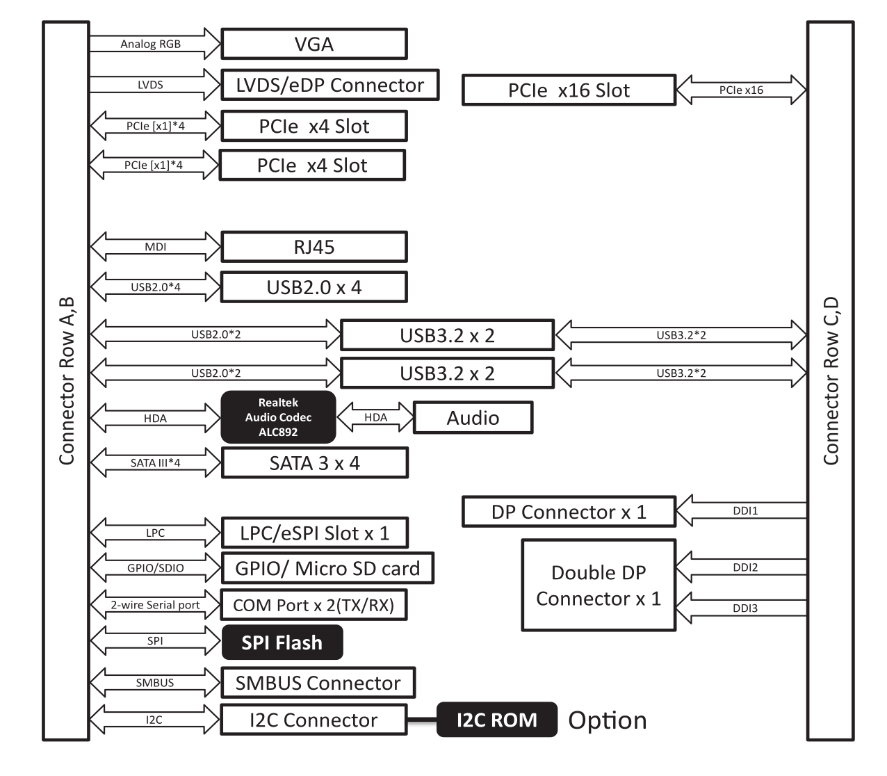 • LVDS/eDP – LVDS สูงสุด 1920 x 1080 (ค่าเริ่มต้น) หรือ eDP รองรับสูงสุด 3840 x 2160 เลือกสวิตช์ได้ตามรายการ BoM