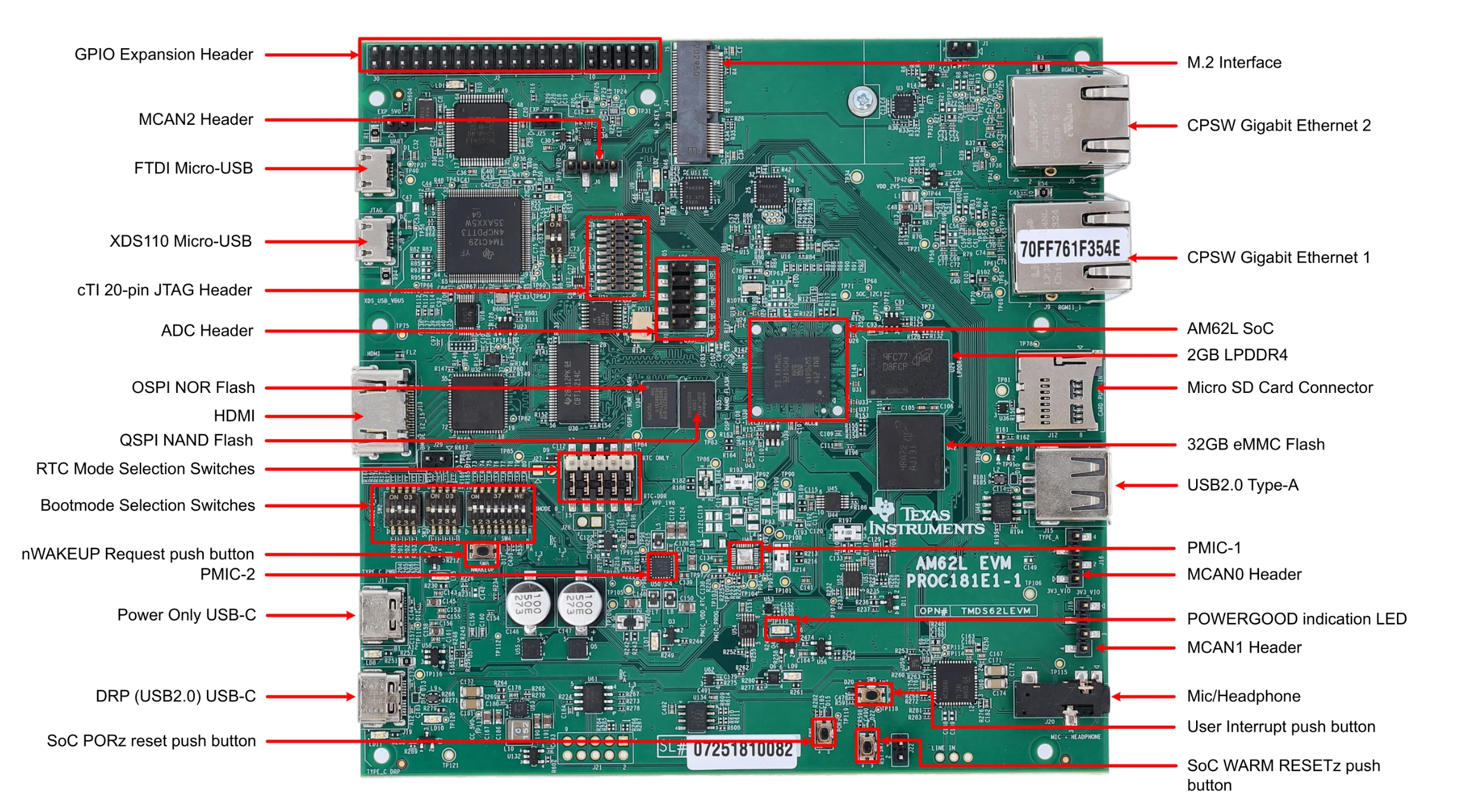 โมดูล AM62L SoM มาพร้อมตัวเลือกหน่วยความจำ LPDDR4 หรือ DDR4, หน่วยความจำแฟลช eMMC แบบ 8-bit และโมดูลเสริม WiFi 5 / Bluetooth 5.0 LE พอร์ต I/O ทั้งหมดถูกนำออกผ่านคอนเนกเตอร์แบบ board-to-board จำนวน 2 ตัว รองรับอินเทอร์เฟซจอภาพแบบ RGB LCD หรือ MIPI DSI, Ethernet 2 พอร์ตแบบ Gigabit พร้อม TSN, USB 2.0, CAN FD, อินพุตอะนาล็อก และอื่น ๆ อีกมากมาย