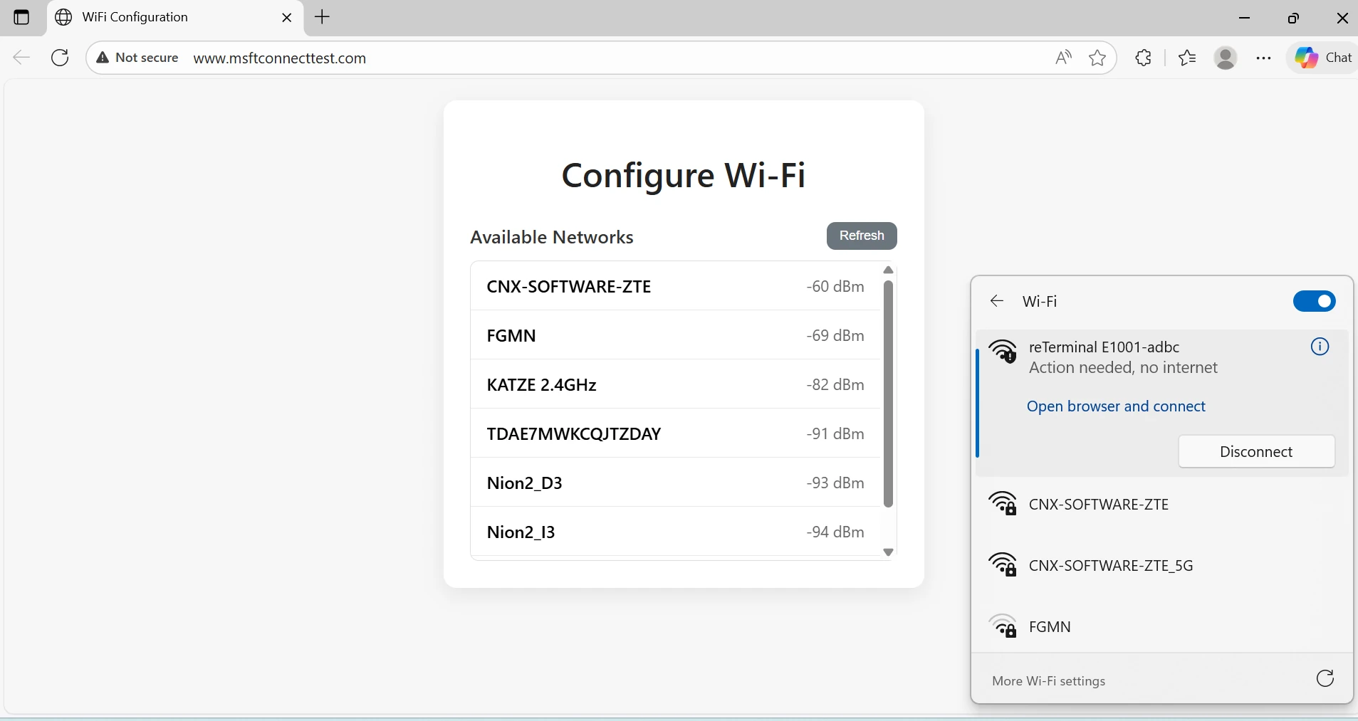การตั้งค่าเครือข่ายสามารถตั้งค่าทั้งผ่านคอมพิวเตอร์หรือแอป SenseCraft HMI เราเลือกเป็นผ่านคอมพิวเตอร์ เริ่มจากเชื่อมต่อ Wi-Fi AP ของอุปกรณ์ ชื่อ “reTerminal E1001-adbc” -> จะถูกนำไปยังหน้า config อัตโนมัติ -> เลือก Wi-Fi บ้านของคุณและกรอกรหัสผ่าน (รองรับเฉพาะ Wi-Fi 2.4GHz ไม่รองรับ 5GHz)