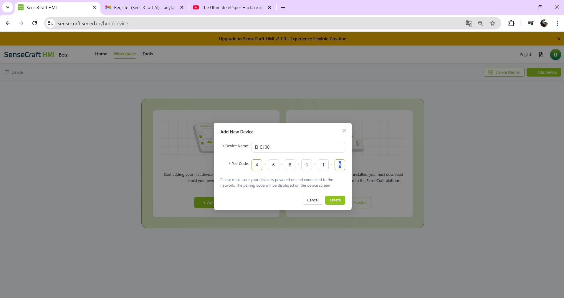 เมื่อเสร็จเรียบร้อยแล้วไปที่ Workspace คลิก Add Device -> ตั้งชื่ออุปกรณ์และกรอก pairing code