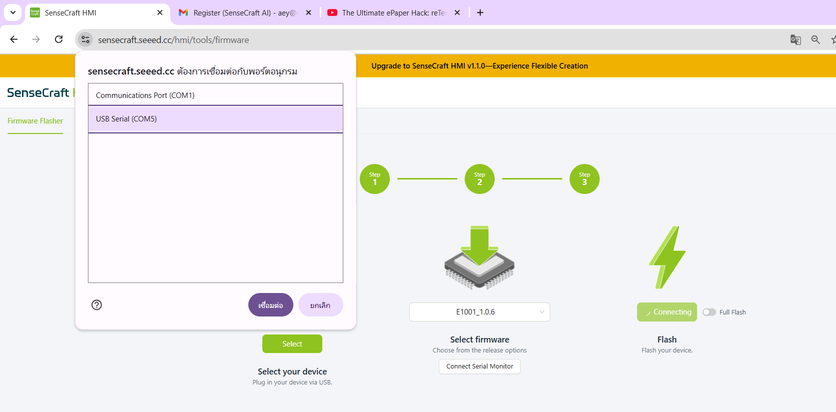 โดยเชื่อมต่อ reTerminal E1001 เข้ากับคอมพิวเตอร์ผ่านสาย USB-C -> เลือกอุปกรณ์ reTerminal E1001 -> เลือกเฟิร์มแวร์เวอร์ชันล่าสุด -> คลิก Flash และรอจนเสร็จ