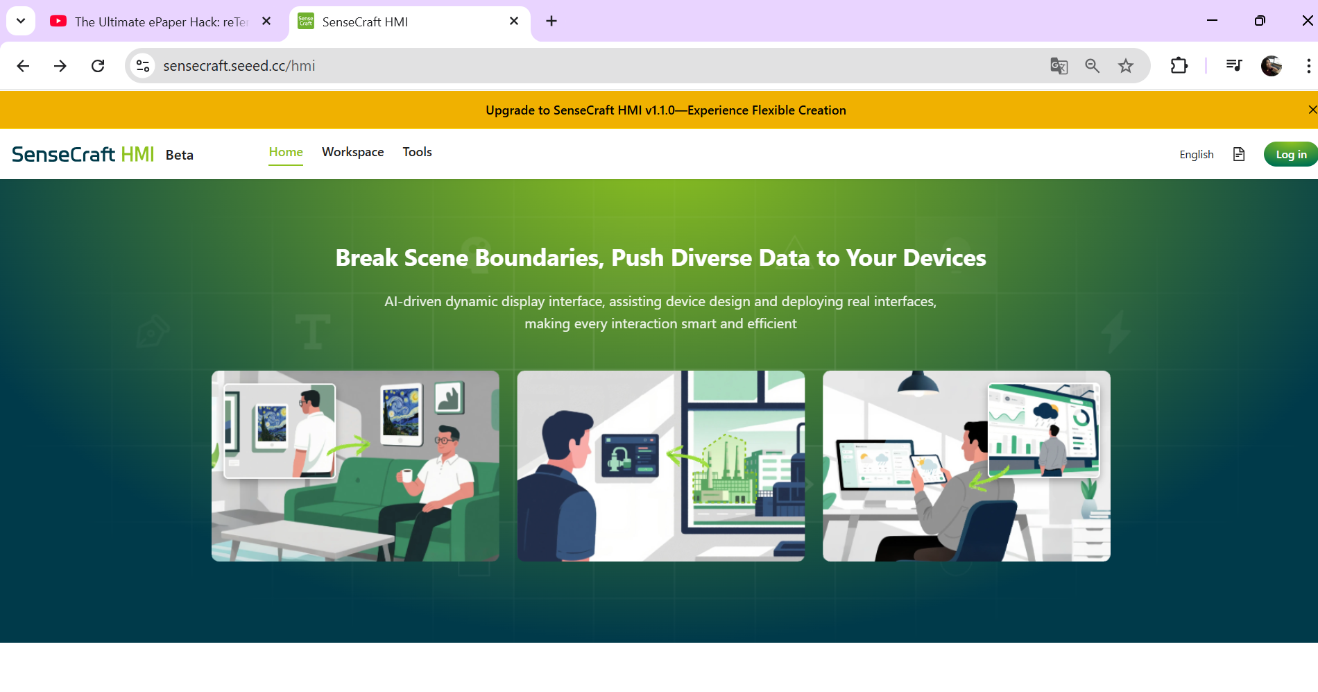 reTerminal E1001 และ E1002 ePaper Display สามารถทำงานร่วมกับแพลตฟอร์ม SenseCraft HMI แบบ no-code ซึ่งมีอินเทอร์เฟซผ่านเว็บสำหรับสร้างและจัดการเนื้อหาที่จะแสดงบนอุปกรณ์