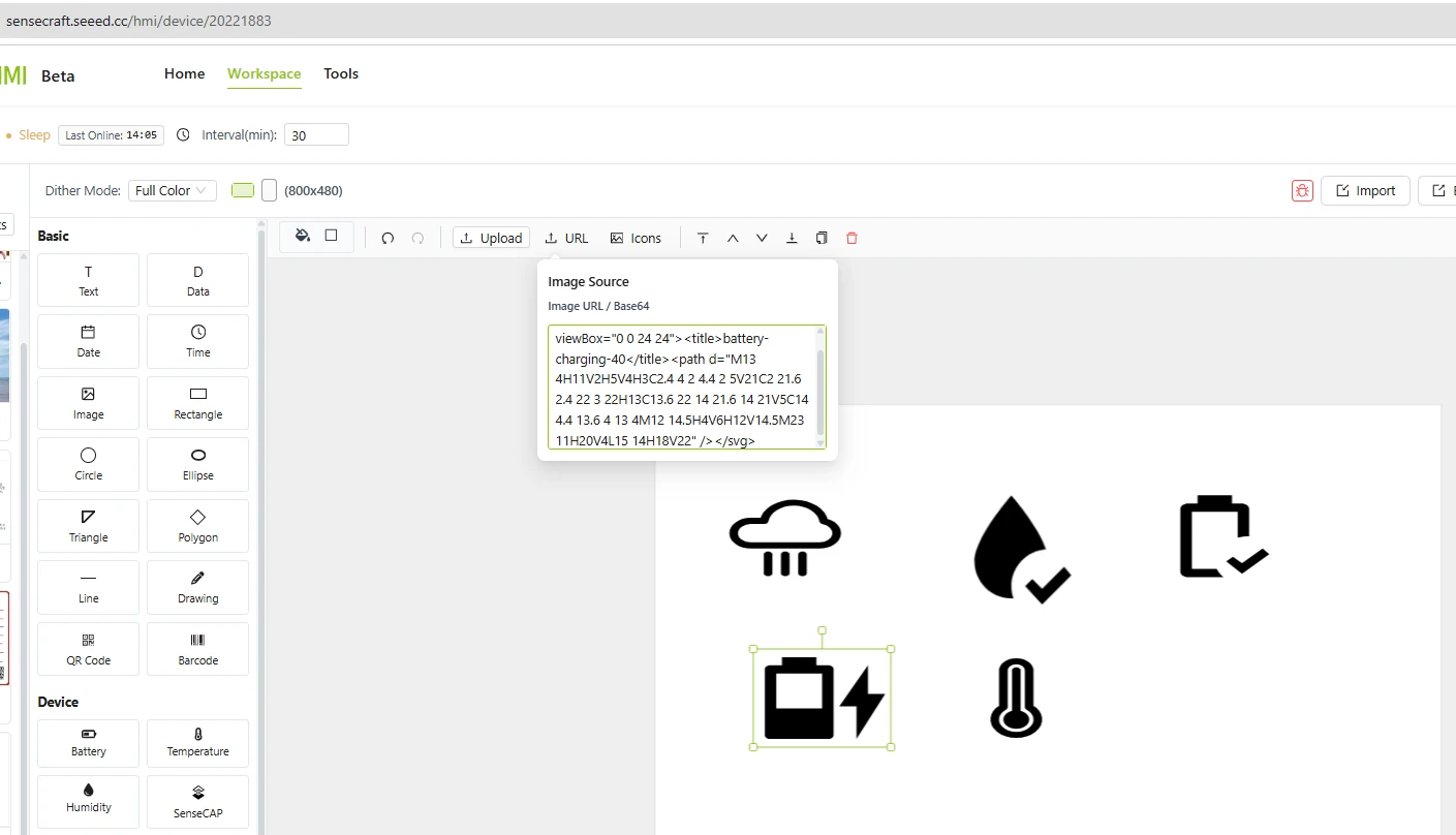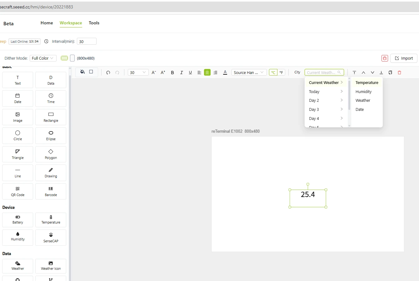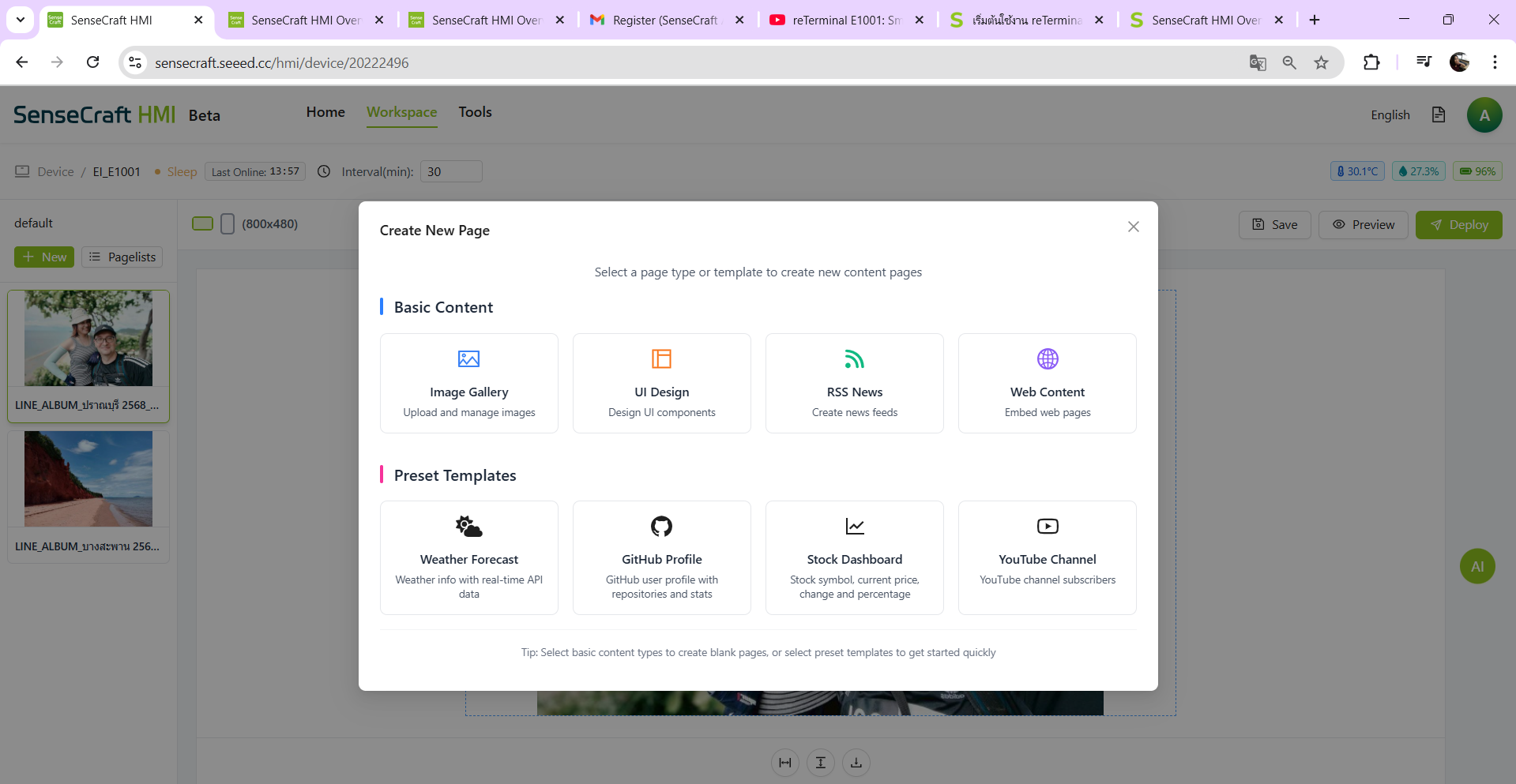 เมื่อเสร็จเรียบร้อยแล้วเรามาสร้างหน้าแดชบอร์ด (Dashboard) ซึ่ง SenseCraft HMI มีเครื่องมือสร้างคอนเทนต์ที่ทรงพลัง เช่น Gallery ทำให้ reTerminal เป็นกรอบรูปดิจิทัล สามารถสร้างสไลด์โชว์ปรับระยะเวลาได้, Canvas ออกแบบเองด้วยการลากวาง เช่น ข้อความ รูปภาพ เวลา วันที่ อากาศ วิดเจ็ตกราฟ รูปทรงและเส้นแบ่ง, RSS Feed แสดงข่าวหรือบล็อกจาก RSS ได้, Web Content Display ดึงส่วนหนึ่งของเว็บไซต์มาแสดง เช่น ตารางขนส่ง หุ้น ข่าว, และยังสามารถกำหนดเวลาการอัปเดตรูปภาพ, รูปแบบสี, แนวตั้งแนวนอน