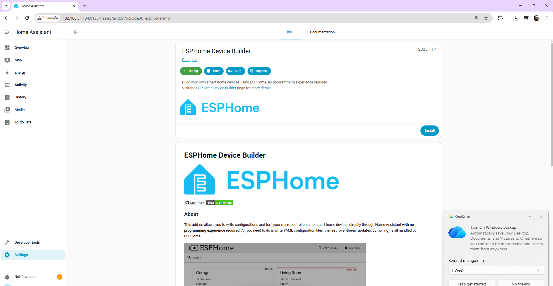 หลังจากนั้นให้ติดตั้ง ESPHome Device Buider โดยไปที่ Settings -> Add-ons -> HSPHome Device Buider