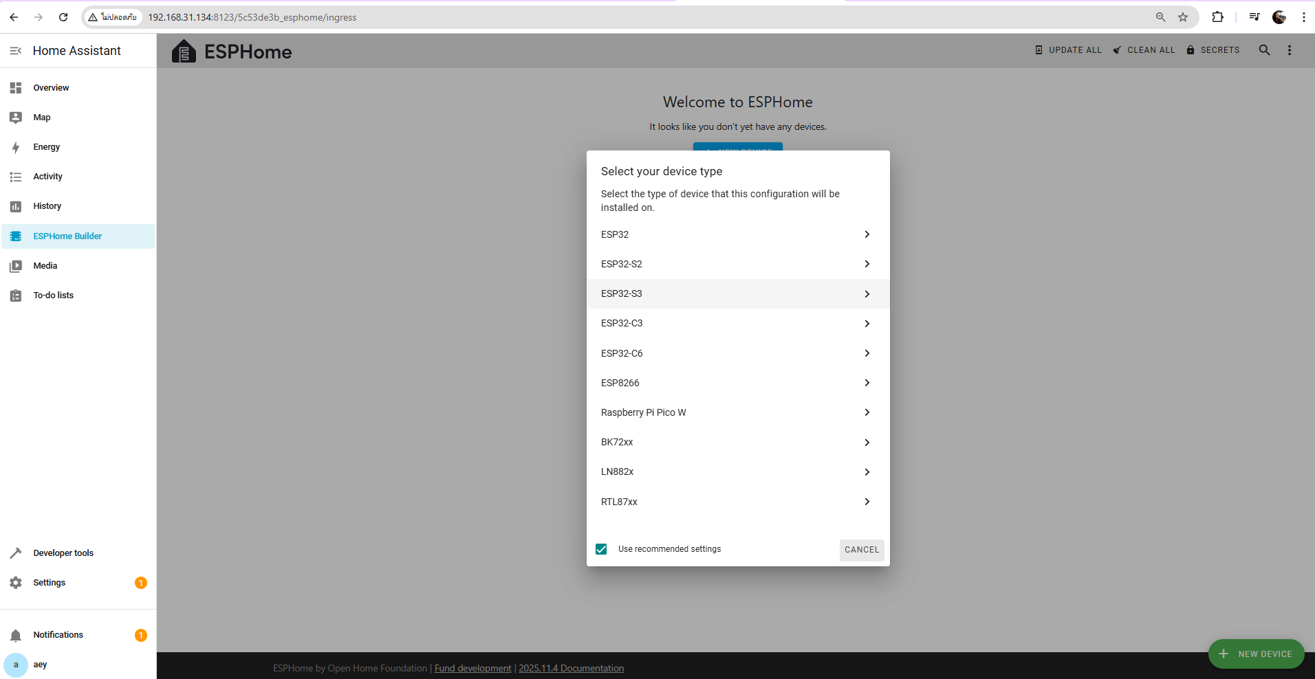 เพิ่มอุปกรณ์ใหม่ ไปที่ ESPHome -> NEW DEVICE -> ตั้งชื่ออุปกรณ์ตามที่ต้องการ และเลือก ESP32-S3
