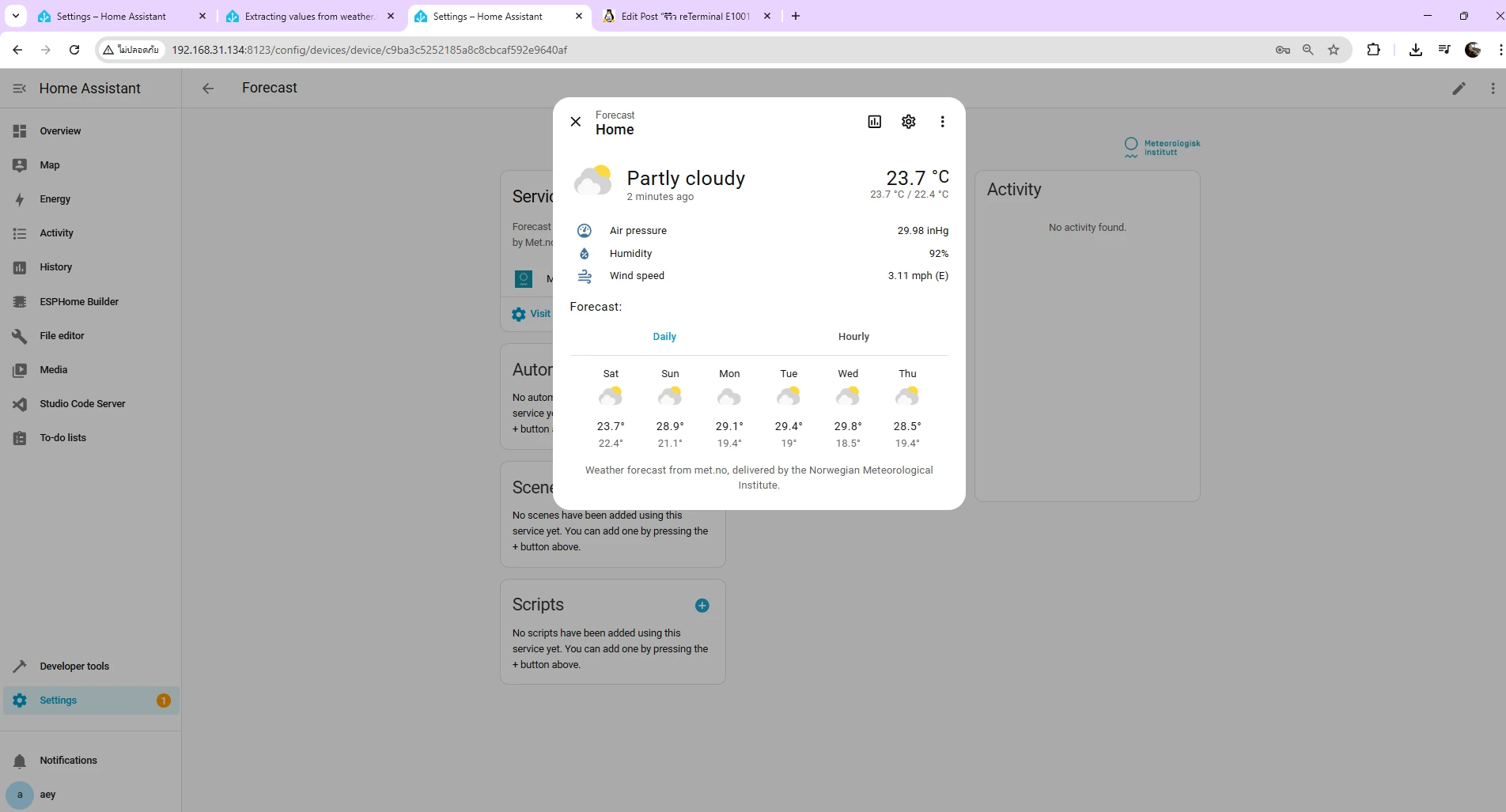 Integration: Meteorologisk institutt (Met.no) สภาพอากาศนี้ถูกติดตั้งมาให้แล้วใน Home Assistant โดยค่าเริ่มต้น และสามารถให้ข้อมูลพยากรณ์อากาศตามตำแหน่งของคุณได้ โดยสามารถตั้งค่าหน่วย (°C, % และอื่นๆ)