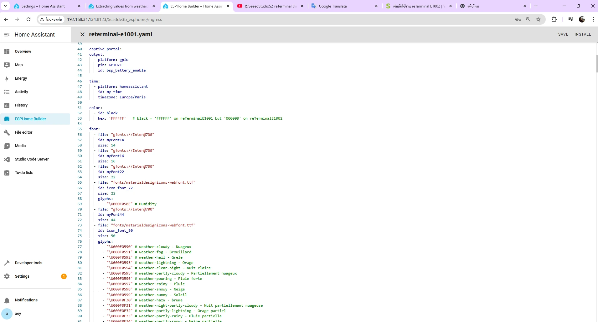 แล้วไปที่ ESPHome แก้ไขไฟล์ YAML ของ reTerminal E1001 จากใน github