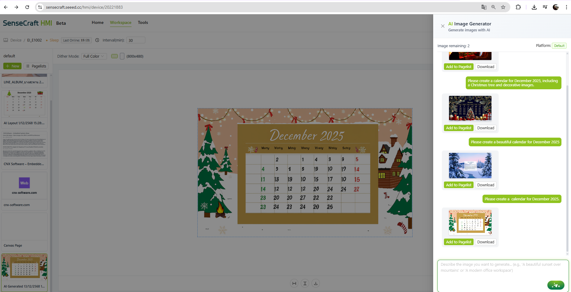 เรามาเริ่มสร้างกัน โดยเราเลือกใช้ reTerminal E1002 เริ่มจาก AI Generator พิมพ์บอกระบบว่าอยากให้แสดงข้อมูลอะไร เช่น สร้างปฏิทิน แล้วระบบจะจัดหน้าให้โดยอัตโนมัติ