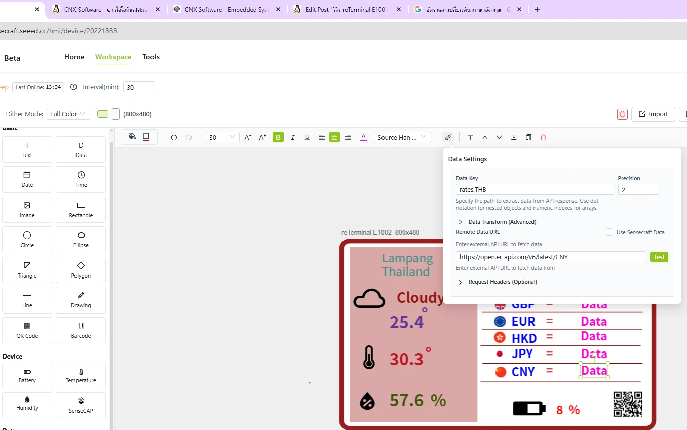 เราต้องการใส่ข้อมูลอัตราแลกเปลี่ยน โดยเลือก Data -> Data Settings -> Data Key = rates.THB -> Precision = 2 -> Remote Data URL = https://open.er-api.com/v6/latest/USD แล้วที่ข้อมูลยังแสดง Data เหมือนเดิม เราจะเห็นเมื่อกด Preview หรือ Display