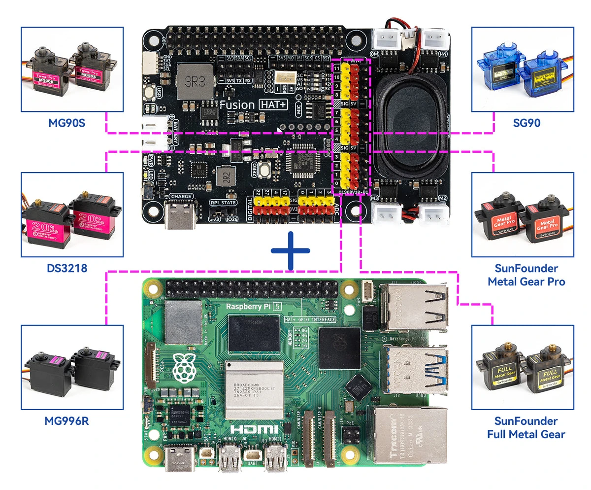 SunFounder Fusion HAT+ สำหรับคอมพิวเตอร์บอร์ดเดี่ยว Raspberry Pi 5/4/3B+ และ Zero เป็นบอร์ดควบคุมมอเตอร์และขยาย GPIO ที่ออกแบบมาให้ทำงานร่วมกับ LLM เช่น ChatGPT หรือ Gemini โดยใช้ลำโพงและไมโครโฟนที่ติดตั้งมาบนบอร์ดสำหรับการโต้ตอบด้วยเสียง