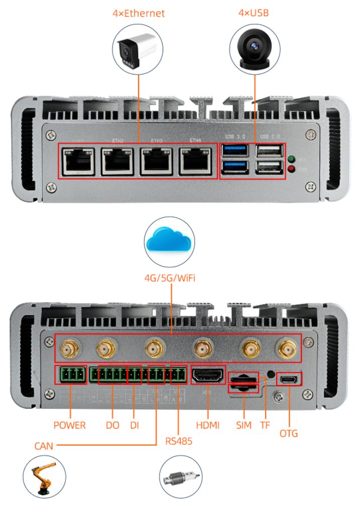 ระบบแบบไม่มีพัดลมนี้รองรับ NVIDIA Jetson Orin Nano รุ่น 4GB (ประสิทธิภาพ 34 TOPS) หรือ รุ่น 8GB (สูงสุด 67 TOPS) พร้อมหน่วยความจำ LPDDR5 ขนาด 4GB/8GB และที่เก็บข้อมูล PCIe x4 NVMe SSD ขนาด 128GB ด้านการเชื่อมต่อรองรับพอร์ต Gigabit Ethernet สูงสุด 4 พอร์ต, USB 3.0/2.0, HDMI 2.0 (รองรับความละเอียด 4K), ช่องใส่ SD card รวมถึงตัวเลือกเสริม 4G/5G และ Wi-Fi dual-band ผ่านโมดูล M.2 นอกจากนี้ยังมีอินเทอร์เฟซอุตสาหกรรมครบครัน เช่น RS-485 แบบแยกสัญญาณ (isolated), CAN, อินพุตแบบ opto-isolated, เอาต์พุต รีเลย์ และ RTC ตัวเครื่องรองรับแหล่งจ่ายไฟ DC ช่วงกว้าง 9–24V, มีการป้องกัน ESD บนอินเทอร์เฟซต่าง ๆ และเหมาะสำหรับการใช้งานหลากหลายรูปแบบ เช่น AGV, ระบบตรวจสอบด้วยภาพ (visual inspection), โรงงานอัจฉริยะ, การวิเคราะห์การจราจรอัจฉริยะ, อุปกรณ์ทางการแพทย์ และหุ่นยนต์เชิงพาณิชย์ขนาดเล็ก