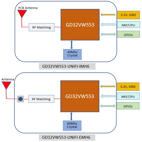 ไมโครคอนโทรลเลอร์ GD32VW553 ภายในมาพร้อม SRAM ขนาด 320KB และ Flash บนชิปขนาด 4096KB รองรับอัตราการเชื่อมต่อสูงสุด 114.7 Mbps สำหรับ WiFi และ 2 Mbps สำหรับ Bluetooth LE โมดูล UNIFI เปิดขา GPIO จากไมโครคอนโทรลเลอร์ออกมาให้ใช้งานได้ 18 ขา และมีให้เลือก 2 ช่วงอุณหภูมิ คือ -40 ถึง +85 °C และ -40 ถึง +105 °C