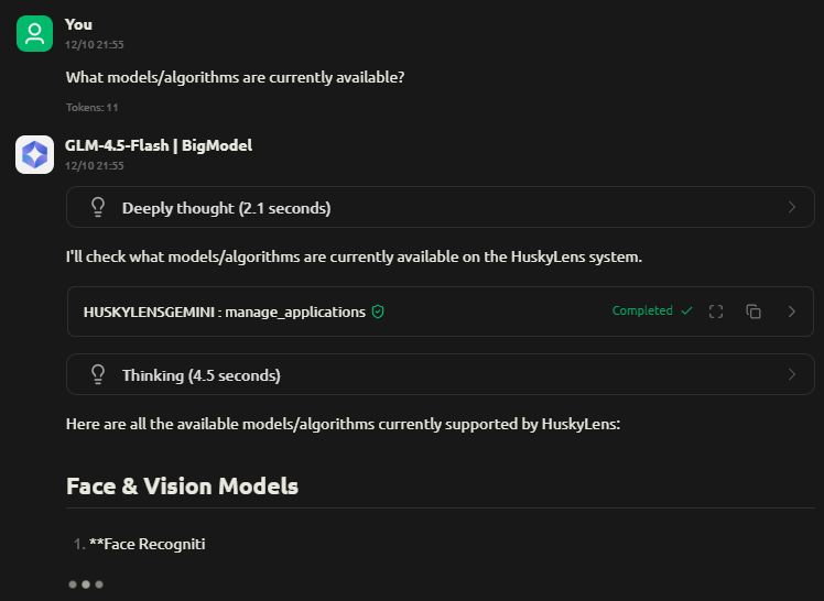 หลังจากรีสตาร์ท ผมสลับไปที่โหมด Chat เสร็จแล้วเลือกโมเดล Gemini ให้เป็น Gemini 2.5 Flash และเลือกกำหนดค่า HUSKYLENS 2 MCP server ของผมให้ตรง จากนั้นผมทดสอบฟังก์ชันการ Chat โดยใช้คำสั่งเดียวกันกับที่แสดงในเอกสารสอนใช้งาน: What models/algorithms are currently available? แต่ว่าผมพบข้อผิดพลาดเกิดขึ้น