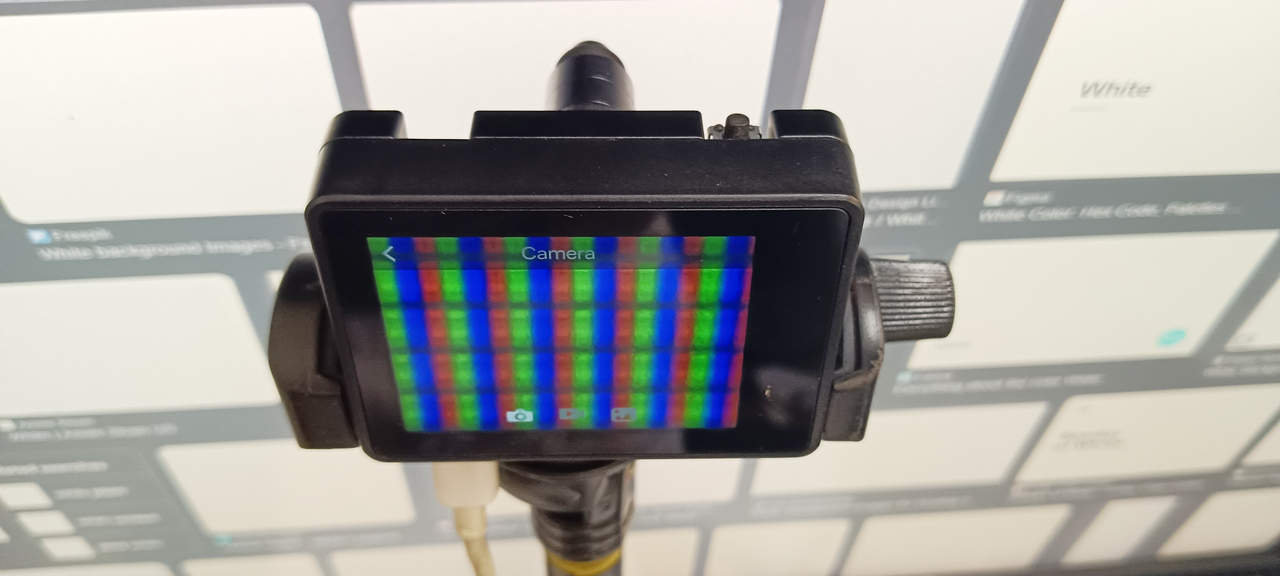 ผมไม่แน่ใจว่ามอดูลเลนส์จุลทรรศน์มีกำลังขยาย 30 เท่าจริงหรือไม่ แต่มันก็ทำงานได้ดีครับ ดังที่แสดงในรูปภาพต่อไปนี้ ซึ่งผมจับภาพขยายของจอมอนิเตอร์ LCD ที่กำลังแสดงภาพสีขาว สามารถมองเห็นการจัดเรียงซับพิกเซล (sub-pixel) สีแดง เขียว และน้ำเงินได้อย่างชัดเจน แต่จะสังเกตว่าภาพที่แสดงบนหน้าจอ HUSKYLENS 2 นั้นจะดูเบลอเล็กน้อยเพราะมอดูลนั้นสั่นบ้างในระหว่างการถ่ายภาพ