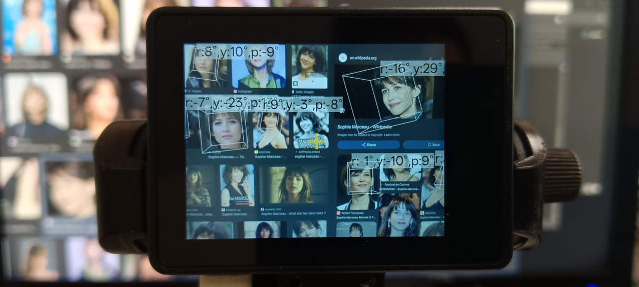 โมเดล AI ในตัวอีกอันที่น่าสนใจคือโหมด Orientation Detection โดยโมเดลนี้สามารถตรวจหาใบหน้าและรู้จำทิศทางที่หน้ากำลังหันไปได้ แต่ว่าน่าเสียดายที่ในช่วงเวลาของการรีวิวนี้ ยังไม่มีข้อมูลรายละเอียดเพิ่มเติมเกี่ยวกับโมเดลนี้บนเว็บไซต์อย่างเป็นทางการให้อ่านรายละเอียดเพิ่มเติมได้ รูปภาพต่อไปนี้แสดงการประมาณทิศทางใบหน้าโดยใช้ภาพของนักแสดงหญิงชาวฝรั่งเศสจากการค้นหาด้วย Google โดยกล้องจะแสดงใบหน้าที่ตรวจหาพบแต่ละใบหน้าและจะแสดงข้อมูลการหมุนซ้อนทับอยู่ ซึ่งผมคาดว่าจะเป็นมุม yaw, pitch และ roll