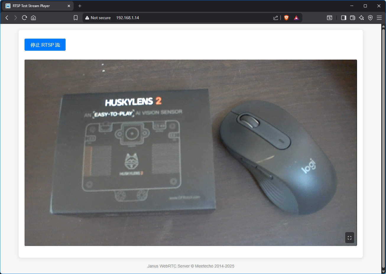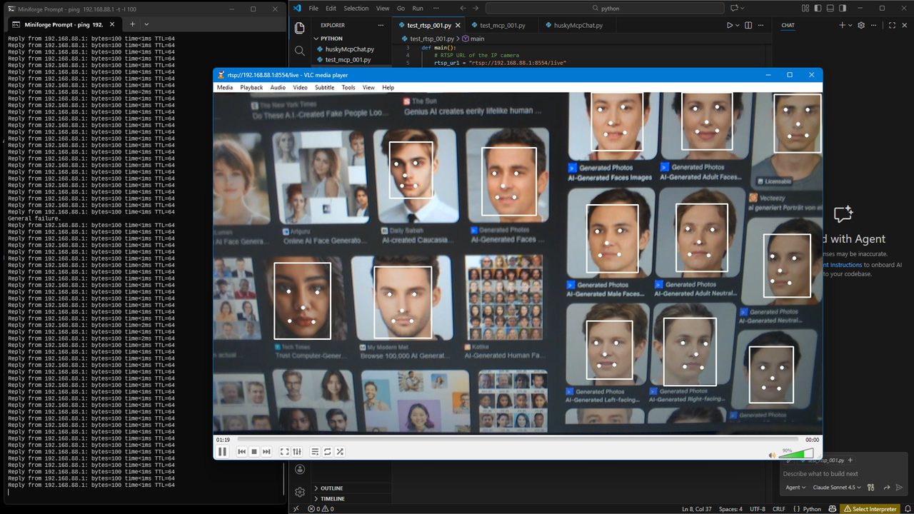 ผมทดสอบการสตรีมวิดีโอผ่านโพรโทคอล RTSP โดยใช้ Python และ OpenCV ด้วย RTSP-URL ที่ให้มา ซึ่งการเชื่อมต่อสำเร็จและเฟรมวิดีโอถูกสตรีมอย่างถูกต้อง ผมยังได้ทดสอบการสตรีมวิดีโอแบบไร้สายโดยการเปิดใช้งานการเชื่อมต่อ Wi-Fi และเปิดตัวเลือกการสตรีม RTSP และ WebRTC ในเมนู Video Streaming และผลก็พบว่าอุปกรณ์ทำงานได้ตามที่คาดหวัง รูปภาพต่อไปนี้แสดงการสตรีมสดที่ดูในเว็บเบราว์เซอร์และใน VLC Media Player