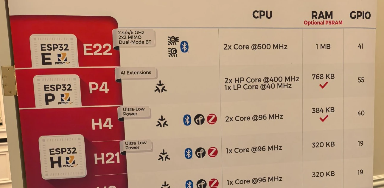 Espressif Systems ได้นำผลิตภัณฑ์มาจัดแสดงในงาน CES 2026, รวมถึงชิปรุ่นใหม่ที่น่าสนใจสองรุ่น ได้แก่ ESP32-E22 SoC แบบ Wi-Fi 6E สามย่านความถี่ และ ESP32-H21 MCU Bluetooth LE พลังงานต่ำพิเศษ (ultra-low-power) สำหรับอุปกรณ์ที่ใช้พลังงานจากแบตเตอรี่