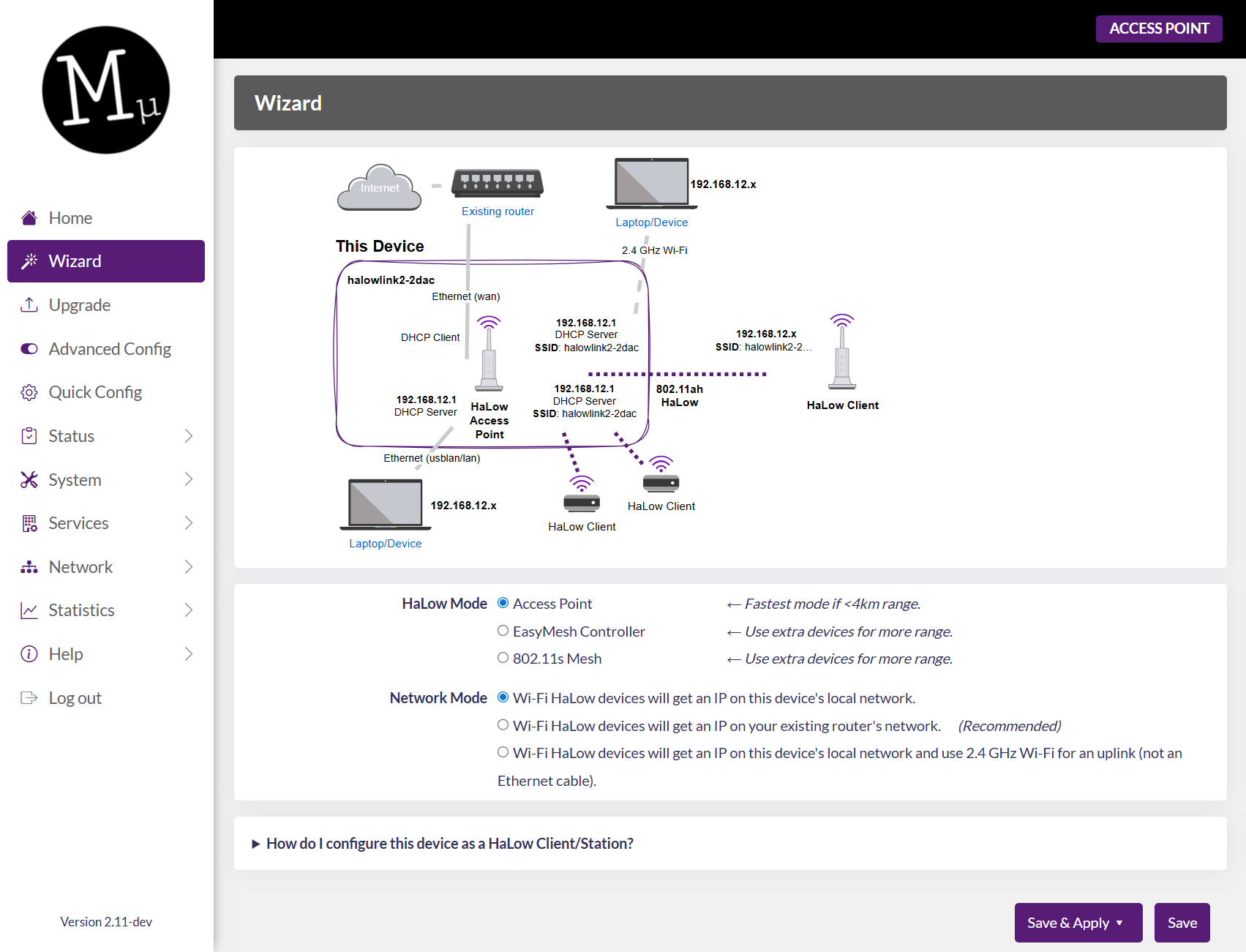 ระบบปฏิบัติการพัฒนาบน OpenWrt 23.05 (มีซอร์สโค้ดบน GitHub), รองรับการตั้งค่าผ่าน WebUI และ SSH/CLI, แดชบอร์ดสถานะ, ตัวช่วยตั้งค่าแบบ Wizard, และการอัปเดต OTA, ความแตกต่างจาก HaLowLink 1 ที่รองรับเฉพาะสหรัฐฯ แคนาดา และออสเตรเลีย โดย HaLowLink 2 เพิ่มการรองรับยุโรป (รวมสหราชอาณาจักร) และญี่ปุ่น ทั้งนี้การใช้งานในประเทศอื่นควรตรวจสอบข้อกำหนดด้านกฎหมายท้องถิ่น