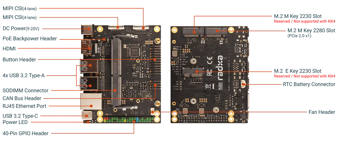 Radxa NX4 SoM สามารถใช้งานร่วมกับ NX4 IO Board เพื่อเข้าถึงเอาต์พุต HDMI, กล้อง MIPI CSI 4 เลน 2 ช่อง, พอร์ต USB 3.2 (Type-A 4 พอร์ต และ Type-C 1 พอร์ต), Gigabit Ethernet พร้อม PoE (ออปชัน) และสล็อต M.2 M-Key 2280 สำหรับ NVMe SSD นอกจากนี้ยังมี GPIO header 40 พิน พร้อมอินเทอร์เฟซ serial ทั่วไป, headers สำหรับพัดลม, แบตเตอรี่ RTC, CAN bus, ปุ่ม และ PoE โดยใช้ไฟจากแจ็ค DC รองรับอินพุต 9–20V