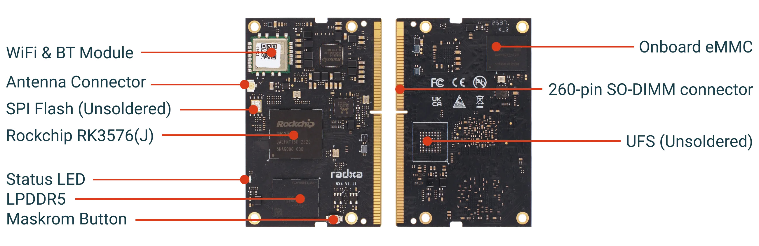 Radxa NX4 เป็นโมดูล (SoM) แบบ SO-DIMM 260 พินที่ใช้ชิป SoC อุตสาหกรรม Rockchip RK3576(J) แบบ octa-core Cortex-A72/A53 พร้อม NPU ประสิทธิภาพ 6 TOPS สำหรับงาน Edge AI รองรับหน่วยความจำ LPDDR5 สูงสุด 16GB และตัวเลือกที่เก็บข้อมูลทั้ง SPI flash, eMMC 5.1 (สูงสุด 256GB) หรือ UFS 2.0 (สูงสุด 1TB)