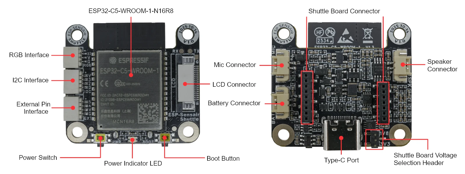โดยเฉพาะอย่างยิ่งบอร์ดหลักของ ESP-SensairShuttle ใช้โมดูล ESP32-C5-WROOM-1-N16R8 ซึ่งรองรับการเชื่อมต่อไร้สายแบบ Dual-band Wi-Fi 6, Bluetooth 5 (LE), Zigbee และ Thread (802.15.4) และสามารถเชื่อมต่อกับ Bosch Sensortec Shuttle Boards ที่ให้มา พร้อมทั้งหน้าจอสัมผัสขนาด 1.83 นิ้ว ไมโครโฟน และลำโพง โดยสามารถจ่ายไฟผ่าน USB หรือแบตเตอรี่ LiPo ได้
