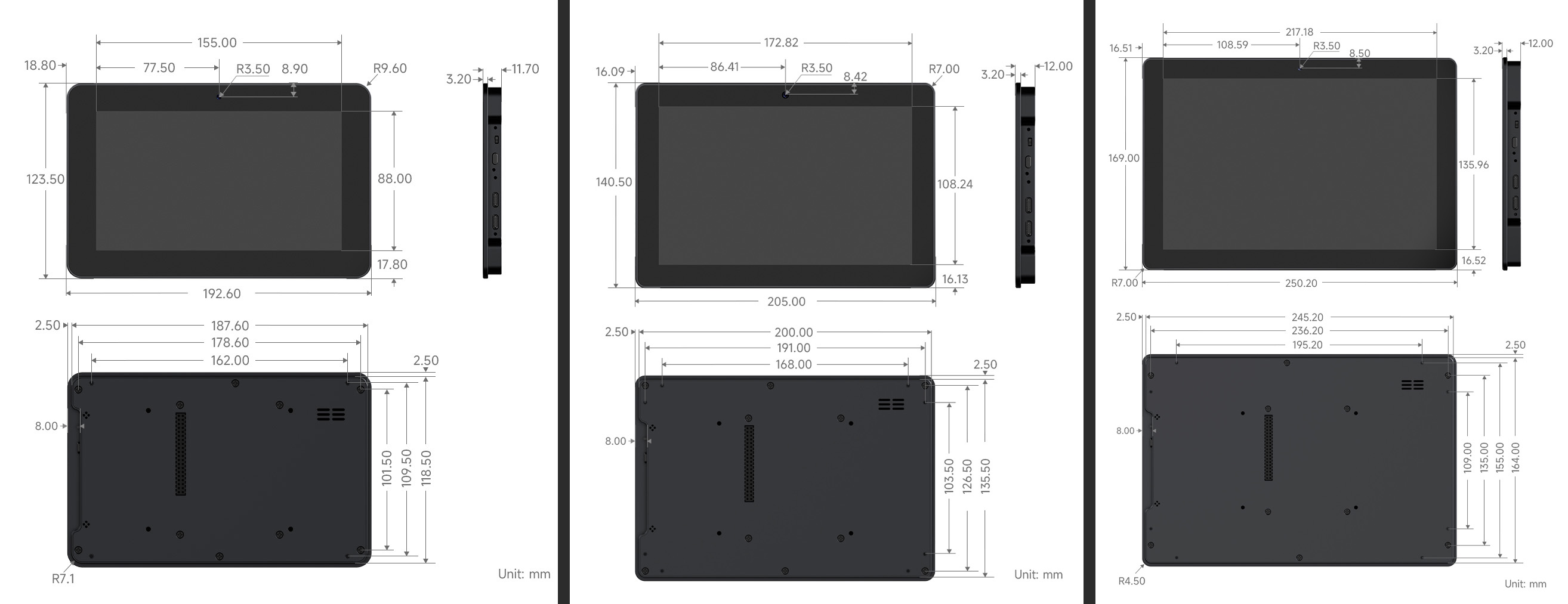 - 8 นิ้ว – ตัวเครื่อง: 205.0 × 140.5 × 12.0 มม., พื้นที่แสดงผล: 172.82 × 108.24 มม.