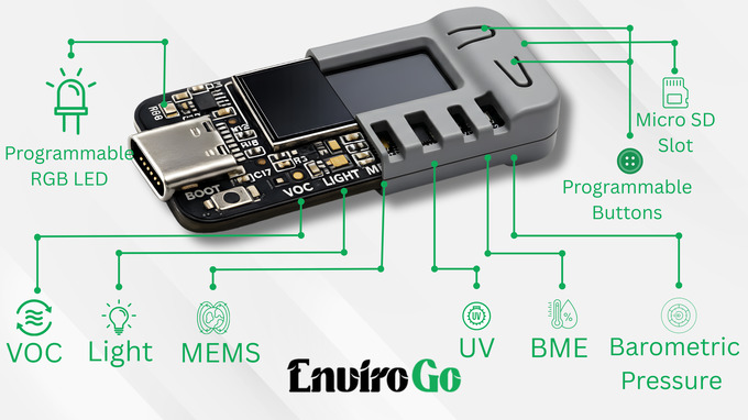 EnviroGo รองรับการเชื่อมต่อ Wi-Fi และ Bluetooth ในตัวผ่าน ESP32-S3 WiSoC มาพร้อมหน้าจอ IPS ขนาด 0.96 นิ้ว, ช่อง microSD สำหรับบันทึกข้อมูลภายในเครื่อง และ RTC สำหรับบันทึกข้อมูลพร้อมเวลา อุปกรณ์สามารถตั้งค่าช่วงเวลาการเก็บข้อมูลได้ มี RGB LED และ บัซเซอร์ สำหรับการแจ้งเตือนด้วยแสงและเสียง และสามารถประมวลผลข้อมูลภายในเครื่องด้วย AI เพื่อคาดการณ์แนวโน้ม เช่น ระดับ VOCs ที่เพิ่มขึ้นหรือการเปลี่ยนแปลงของความชื้น (ระบุว่าต้องใช้ช่วงเรียนรู้ประมาณ 7 วัน) EnviroGo ถูกออกแบบมาสำหรับนักพัฒนา IoT นักวิจัย ผู้ใช้สมาร์ตโฮม และผู้ใส่ใจสุขภาพที่ต้องการติดตามสภาพแวดล้อมระยะยาวและการแจ้งเตือนล่วงหน้า ไม่ใช่แค่การอ่านค่าแบบทันที