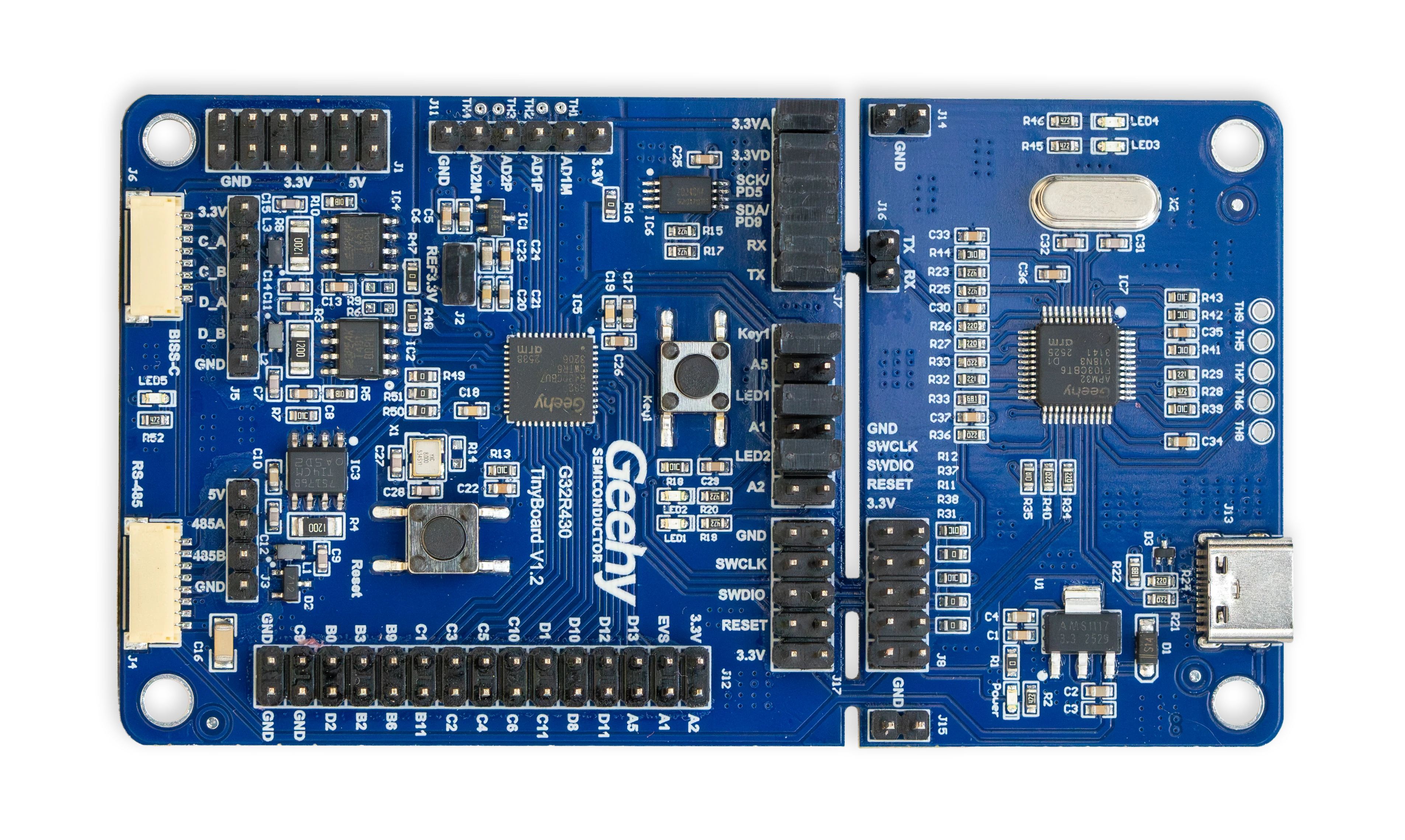 จาก เอกสาร Application Note ของ G32R430 TinyBoard (ซึ่งปัจจุบันมีเฉพาะภาษาจีนเท่านั้น) สามารถเห็นได้ว่าบอร์ดดังกล่าวประกอบด้วย GPIO ที่ใช้งานได้สูงสุด 34 ขา, LED จำนวน 2 ดวง, ปุ่มผู้ใช้ (User Key) และปุ่มรีเซ็ต, อินเทอร์เฟซการสื่อสาร เช่น USART, EEPROM ผ่าน I²C, RS-485 และ RS-422 รวมถึง ดีบักเกอร์ GEEHY-LINK บนบอร์ด ซึ่งรองรับทั้งการดาวน์โหลดเฟิร์มแวร์และการดีบักระบบ