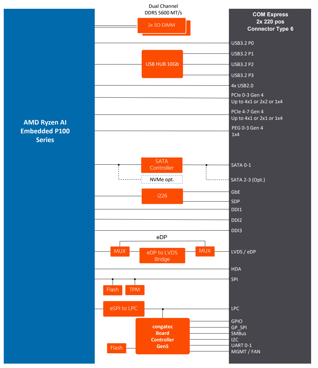 - AMD Ryzen AI Embedded P132 – 6-core/ 12-thread Zen 5 processor สูงสุด 4.5 GHz, แคช: L2 6MB, L3 8MB, กราฟิก RDNA 3.5 จำนวน 4 CU @ 2800 MHz, TDP 28W / 54W (Turbo), NPU 50 TOPS (รวม 59 TOPS)