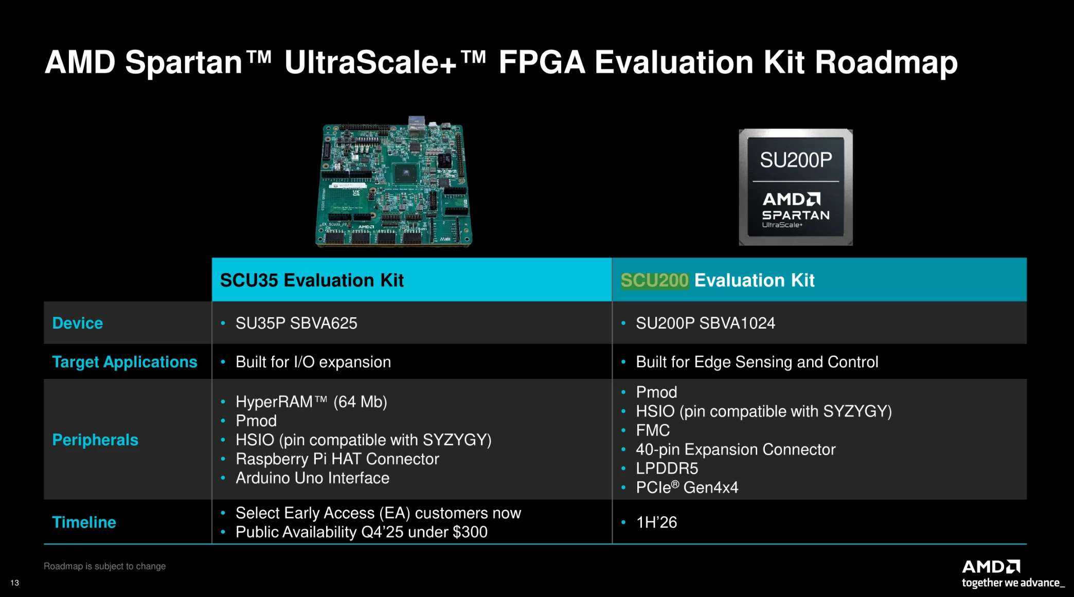ในระหว่างนี้ Spartan UltraScale+ SCU200 Evaluation Kit ที่มีอยู่แล้ว ซึ่งใช้ชิป XCSU200P ที่รองรับการย้ายไปยังแพลตฟอร์มอื่น (migration-capable) ระบุว่าสามารถใช้งานได้ในปัจจุบัน แต่เรายังไม่พบภาพถ่ายหรือข้อมูลรายละเอียดของชุดพัฒนานี้ และจากสไลด์ด้านบนคาดว่าน่าจะเริ่มวางจำหน่ายจริงภายในไม่กี่สัปดาห์นี้, ชุด Evaluation Kit นี้ใช้ FPGA รุ่น SCU200P ที่มี Logic Cells จำนวน 218K พร้อมรองรับ HSIO, Pmod และคอนเนกเตอร์ขยายแบบ 40 พิน รวมถึงมีอินเทอร์เฟซ PCIe Gen4 x4