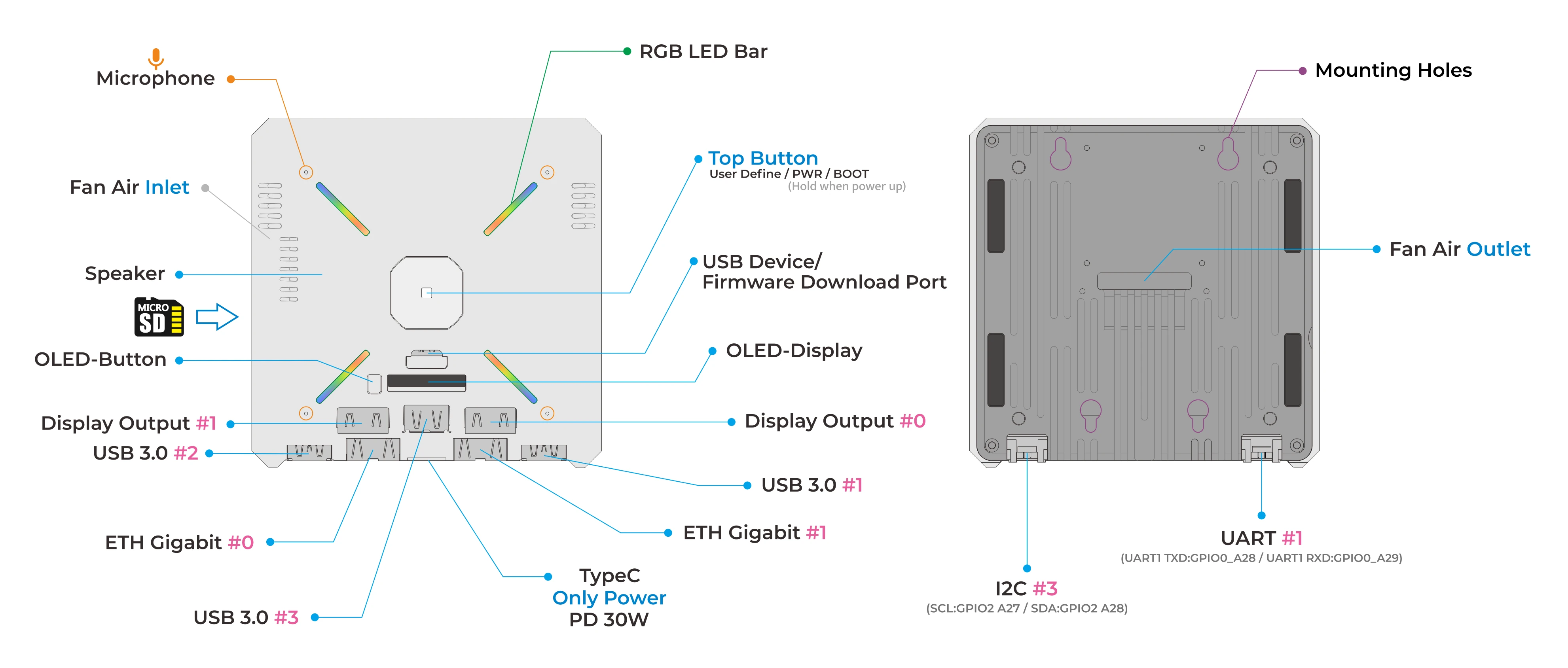 มินิพีซี AI รุ่นนี้มาพร้อม RAM ขนาด 4GB หรือ 8GB, eMMC flash 32GB, ช่องใส่ microSD card, พอร์ต HDMI 2.0 จำนวน 2 พอร์ต (ดูรายละเอียดในสเปค), ชุดไมโครโฟน 4 ตัว, ลำโพงในตัว, พอร์ต Gigabit Ethernet จำนวน 2 พอร์ต, พอร์ต USB 3.2 จำนวน 4 พอร์ต และพอร์ต USB-C จำนวน 2 พอร์ต สำหรับรับส่งข้อมูลและจ่ายไฟ ตัวเครื่องถูกออกแบบมาให้เป็นแพลตฟอร์ม Edge AI ระดับเดสก์ท็อป เหมาะสำหรับงานอย่าง AI vision gateway, ระบบรักษาความปลอดภัยอัจฉริยะ และระบบจัดการอัลบั้มภาพอัจฉริยะภายในเครื่อง